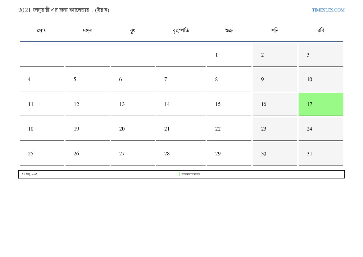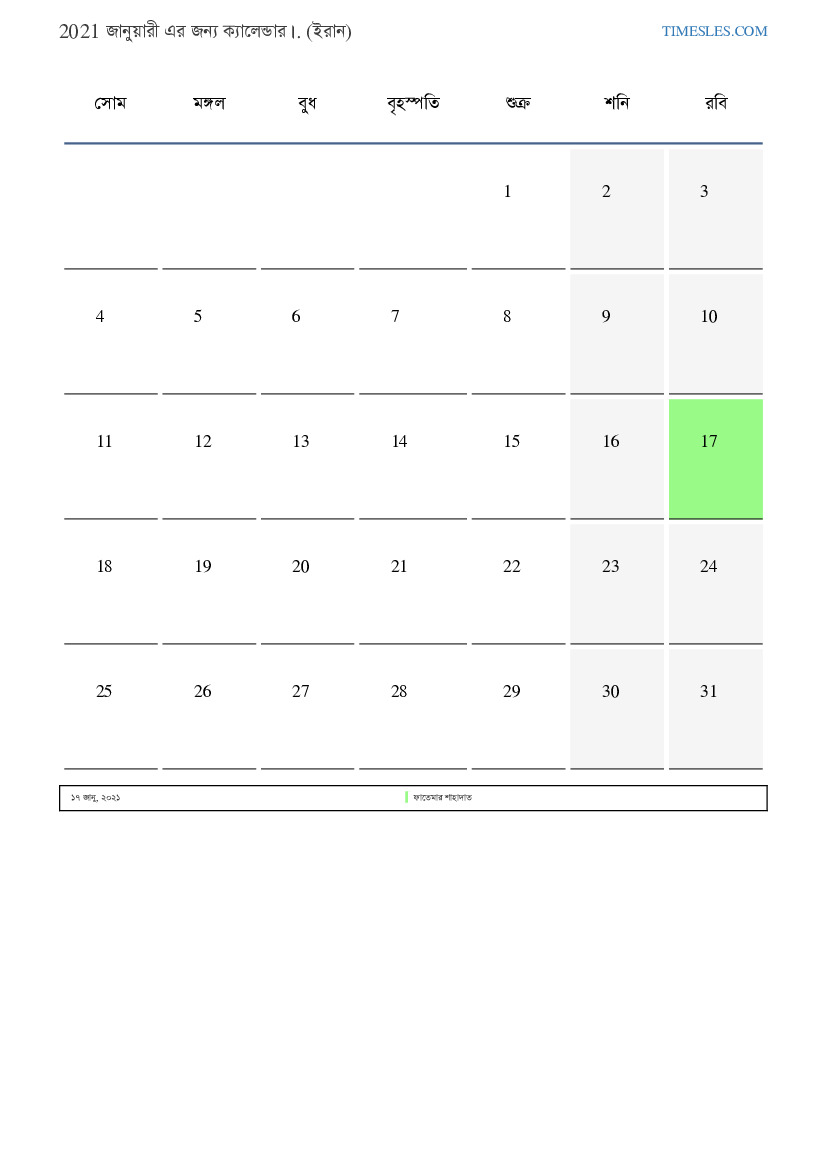 ইরানের জন্য 2021 জানুয়ারী এর জন্য ছুটির দিন এবং সপ্তাহান্তের ক্যালেন্ডার