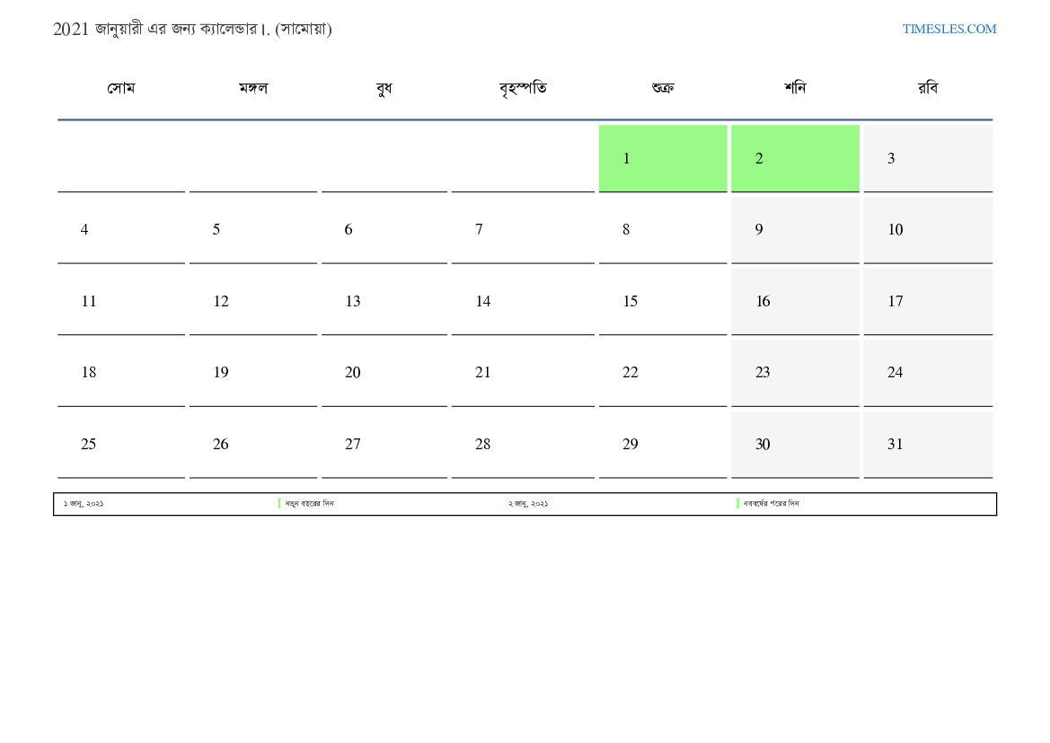 সামোয়া জন্য 2021 জানুয়ারী এর জন্য ছুটির দিন এবং সপ্তাহান্তের ক্যালেন্ডার