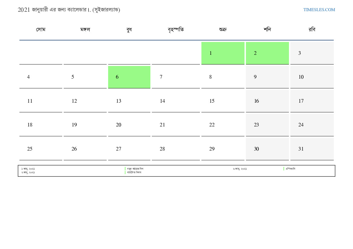 সুইজারল্যান্ডের জন্য 2021 জানুয়ারী এর জন্য ছুটির দিন এবং সপ্তাহান্তের ক্যালেন্ডার