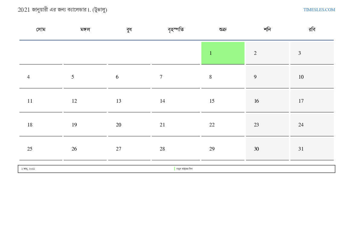টুভালুর জন্য 2021 জানুয়ারী এর জন্য ছুটির দিন এবং সপ্তাহান্তের ক্যালেন্ডার