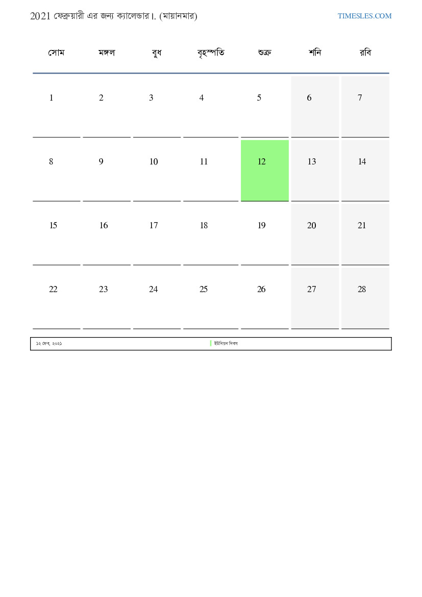 মায়ানমারের জন্য 2021 ফেব্রুয়ারী এর জন্য ছুটির দিন এবং সপ্তাহান্তের ক্যালেন্ডার