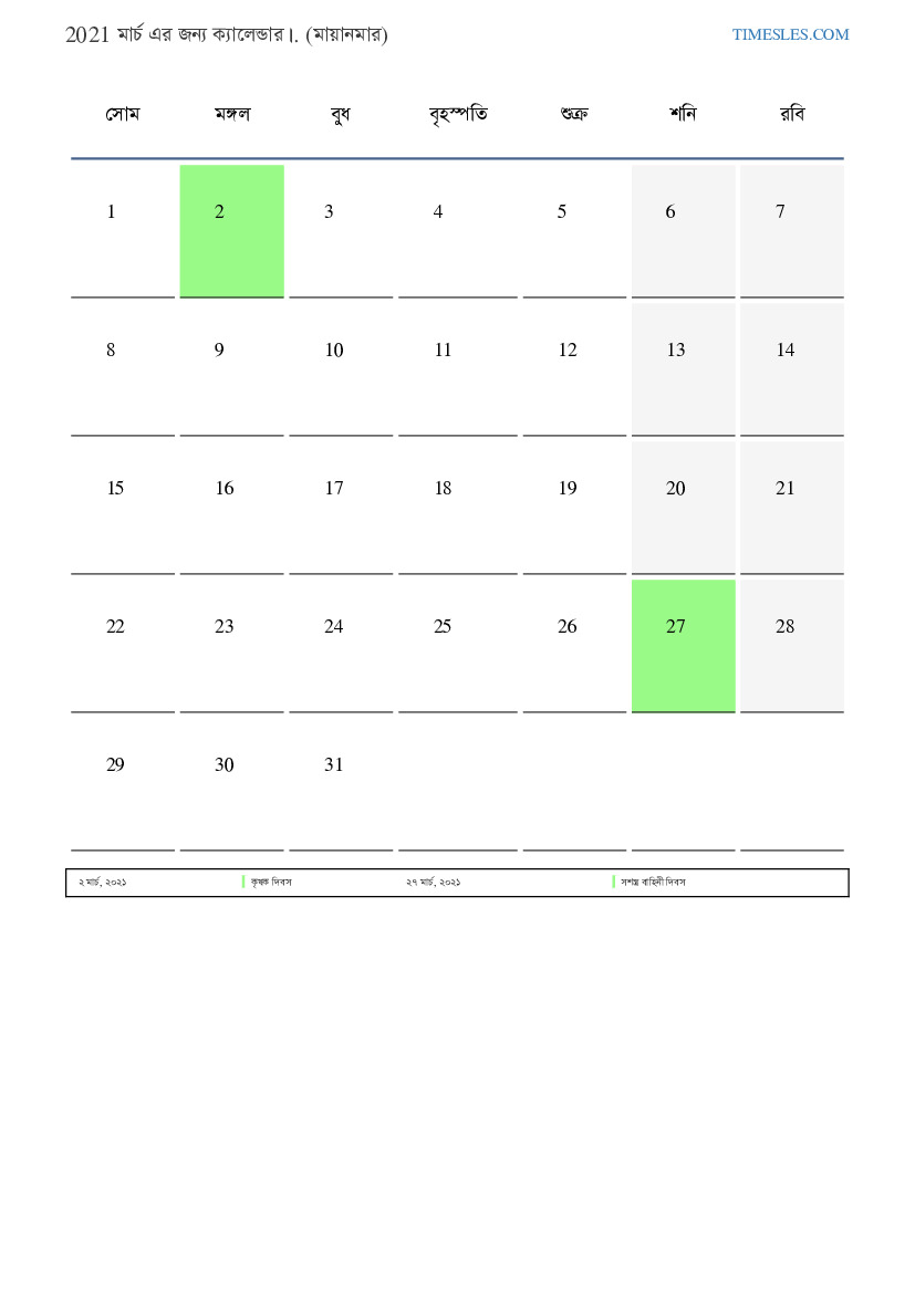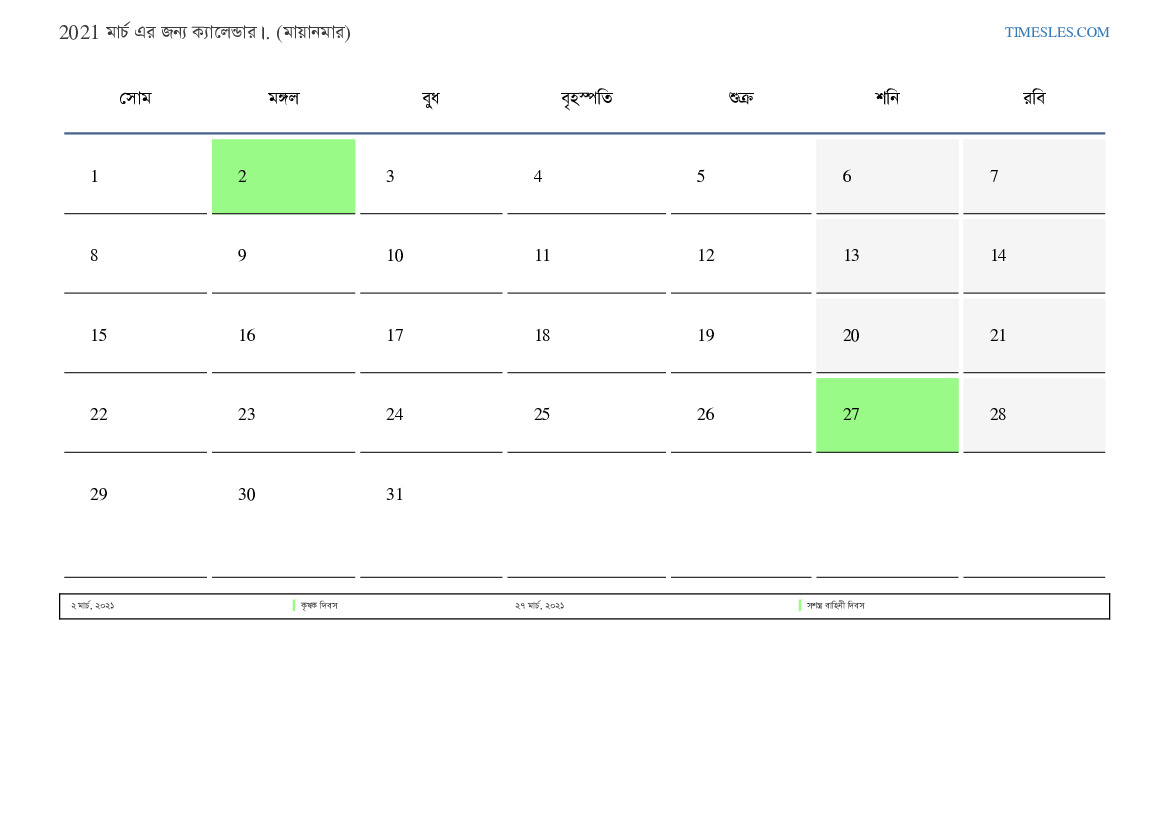 মায়ানমারের জন্য 2021 মার্চ এর জন্য ছুটির দিন এবং সপ্তাহান্তের ক্যালেন্ডার