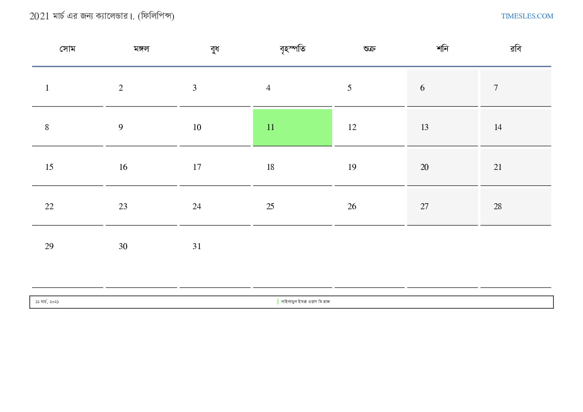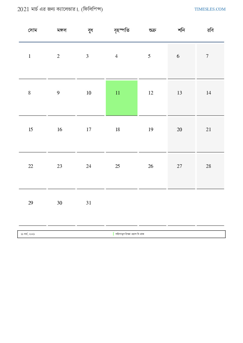 ফিলিপাইন জন্য 2021 মার্চ এর জন্য ছুটির দিন এবং সপ্তাহান্তের ক্যালেন্ডার