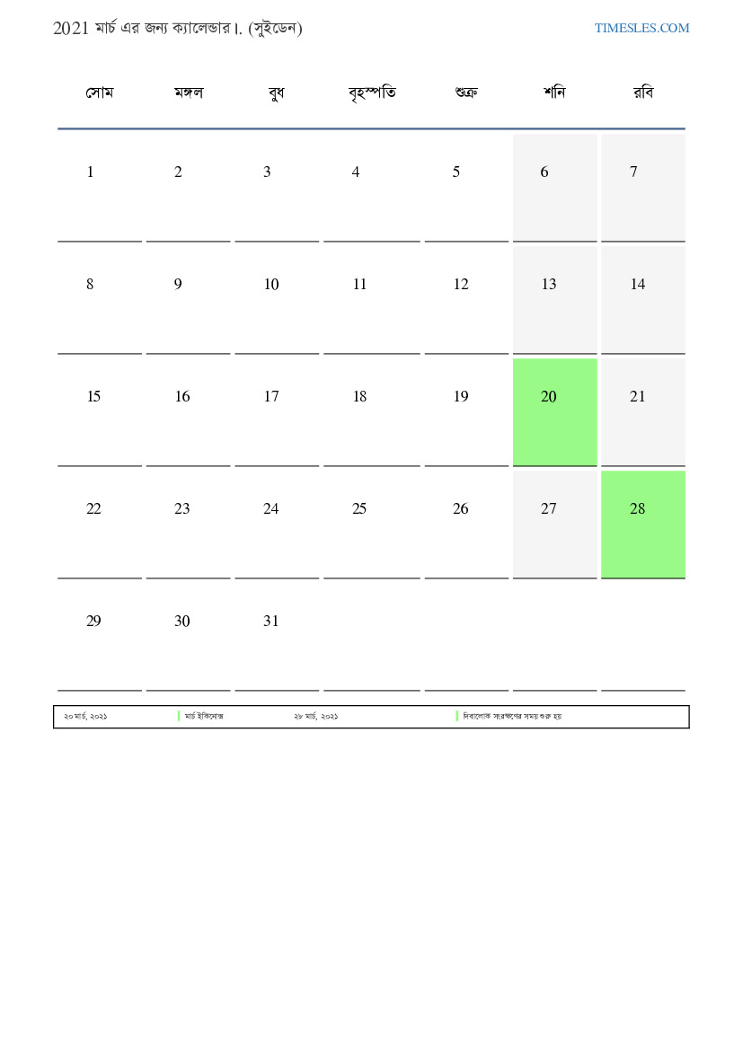 সুইডেনের জন্য 2021 মার্চ এর জন্য ছুটির দিন এবং সপ্তাহান্তের ক্যালেন্ডার