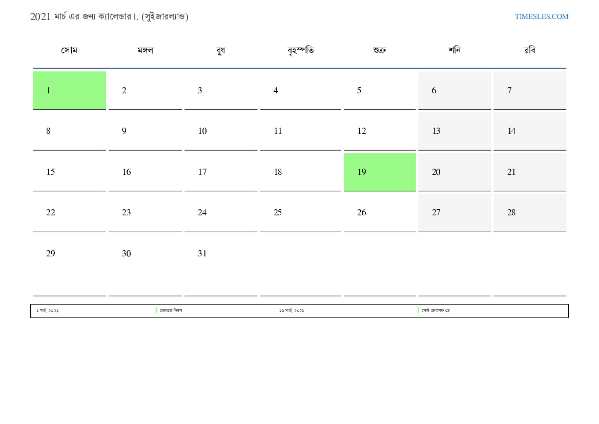 সুইজারল্যান্ডের জন্য 2021 মার্চ এর জন্য ছুটির দিন এবং সপ্তাহান্তের ক্যালেন্ডার