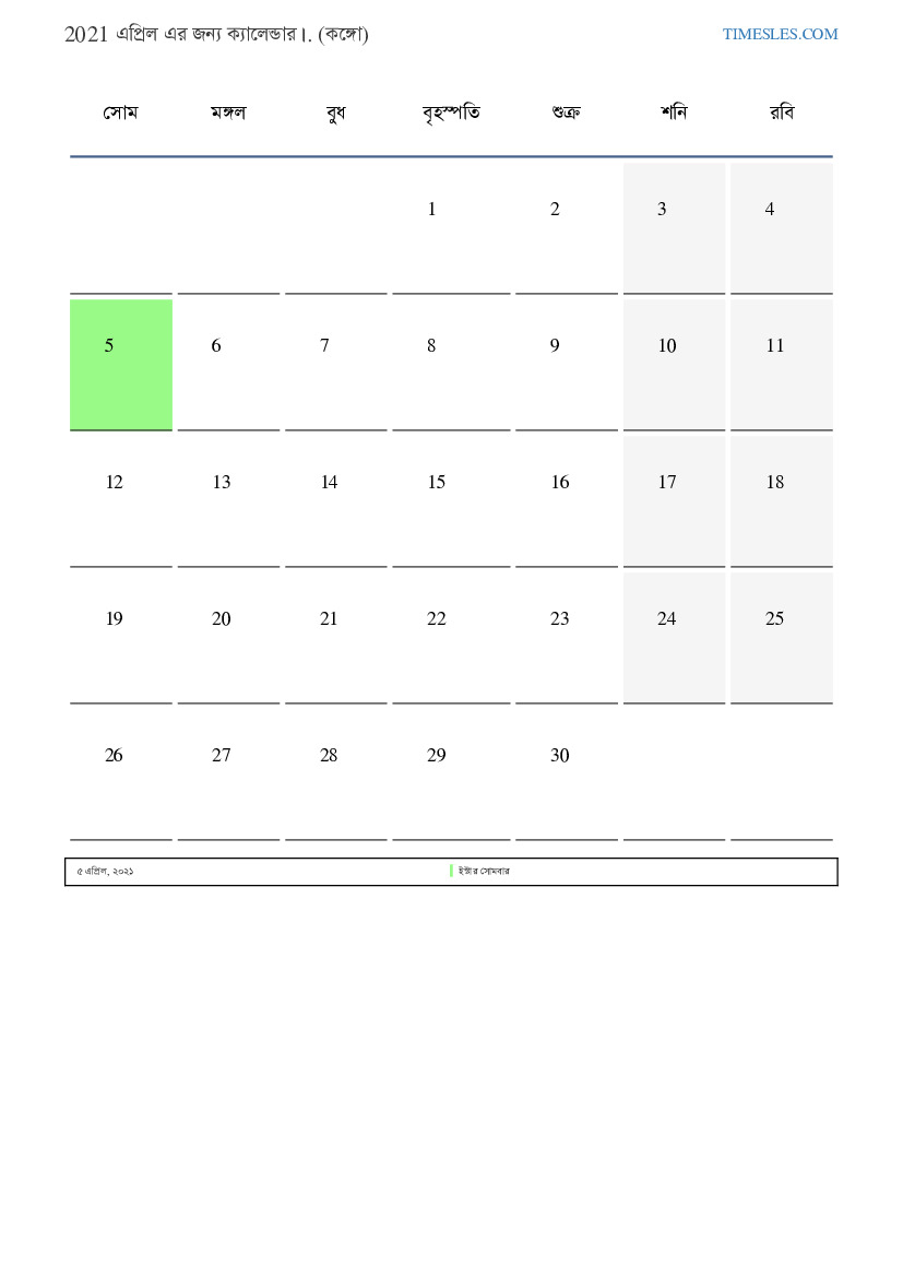কঙ্গোর জন্য 2021 এপ্রিল এর জন্য ছুটির দিন এবং সপ্তাহান্তের ক্যালেন্ডার