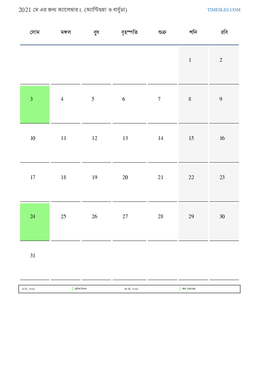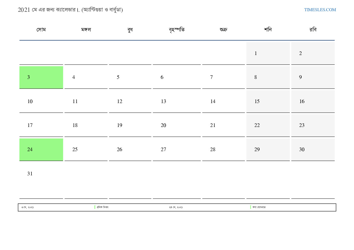 অ্যান্টিগুয়া এবং বার্বুডা জন্য 2021 মে এর জন্য ছুটির দিন এবং সপ্তাহান্তের ক্যালেন্ডার