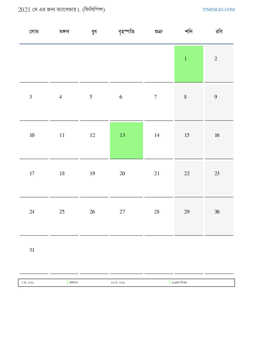 ফিলিপাইন জন্য 2021 মে এর জন্য ছুটির দিন এবং সপ্তাহান্তের ক্যালেন্ডার