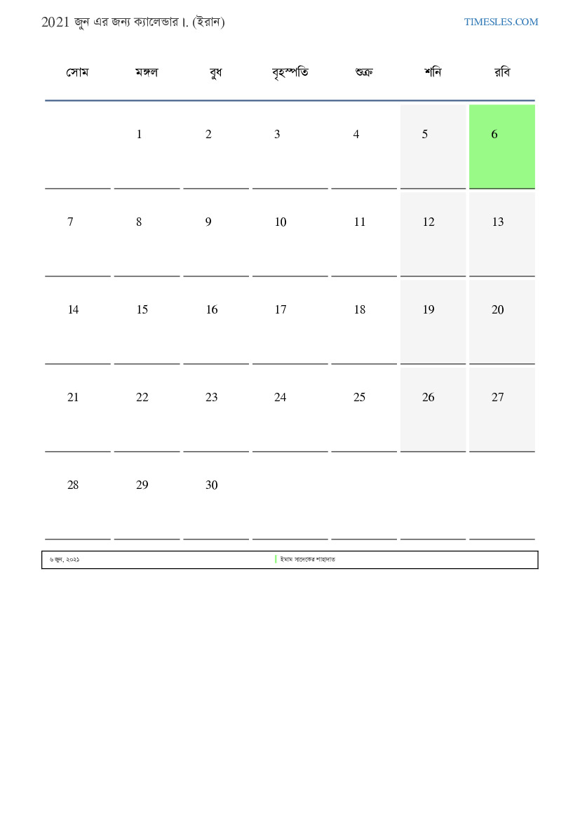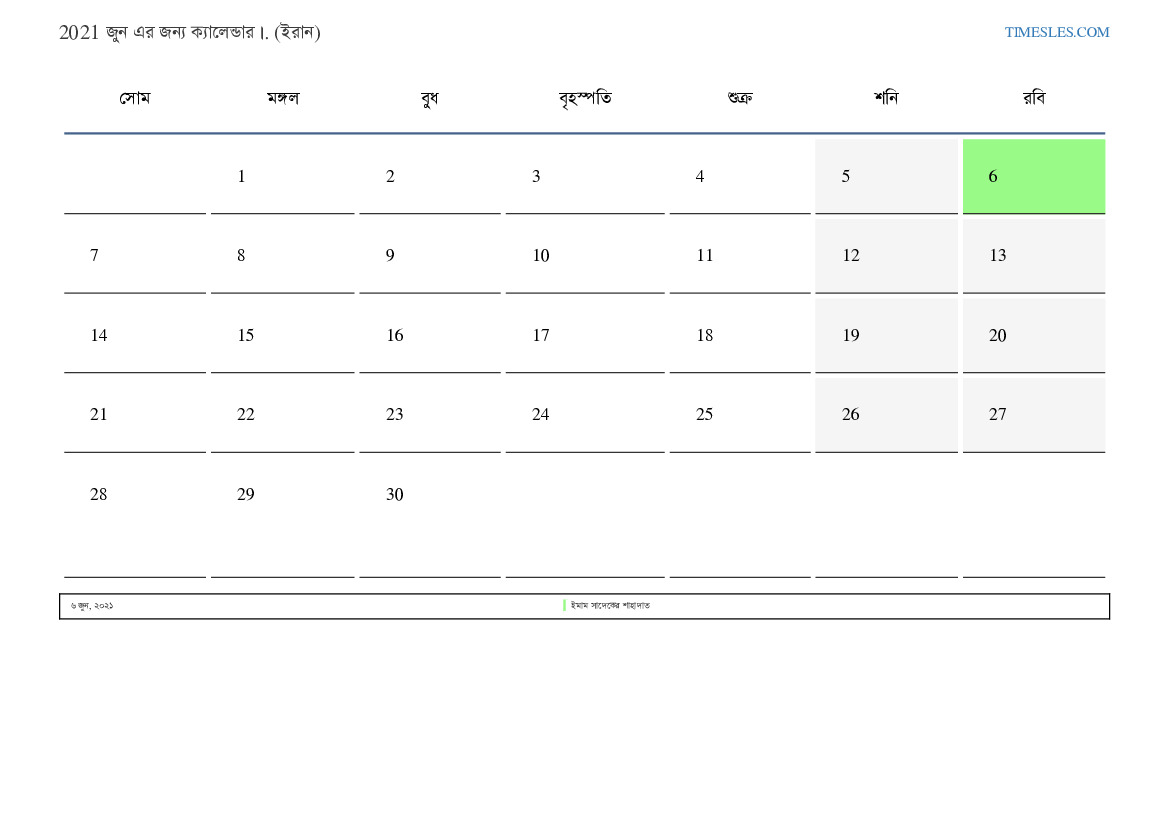 ইরানের জন্য 2021 জুন এর জন্য ছুটির দিন এবং সপ্তাহান্তের ক্যালেন্ডার