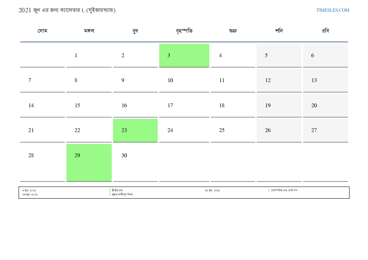 সুইজারল্যান্ডের জন্য 2021 জুন এর জন্য ছুটির দিন এবং সপ্তাহান্তের ক্যালেন্ডার