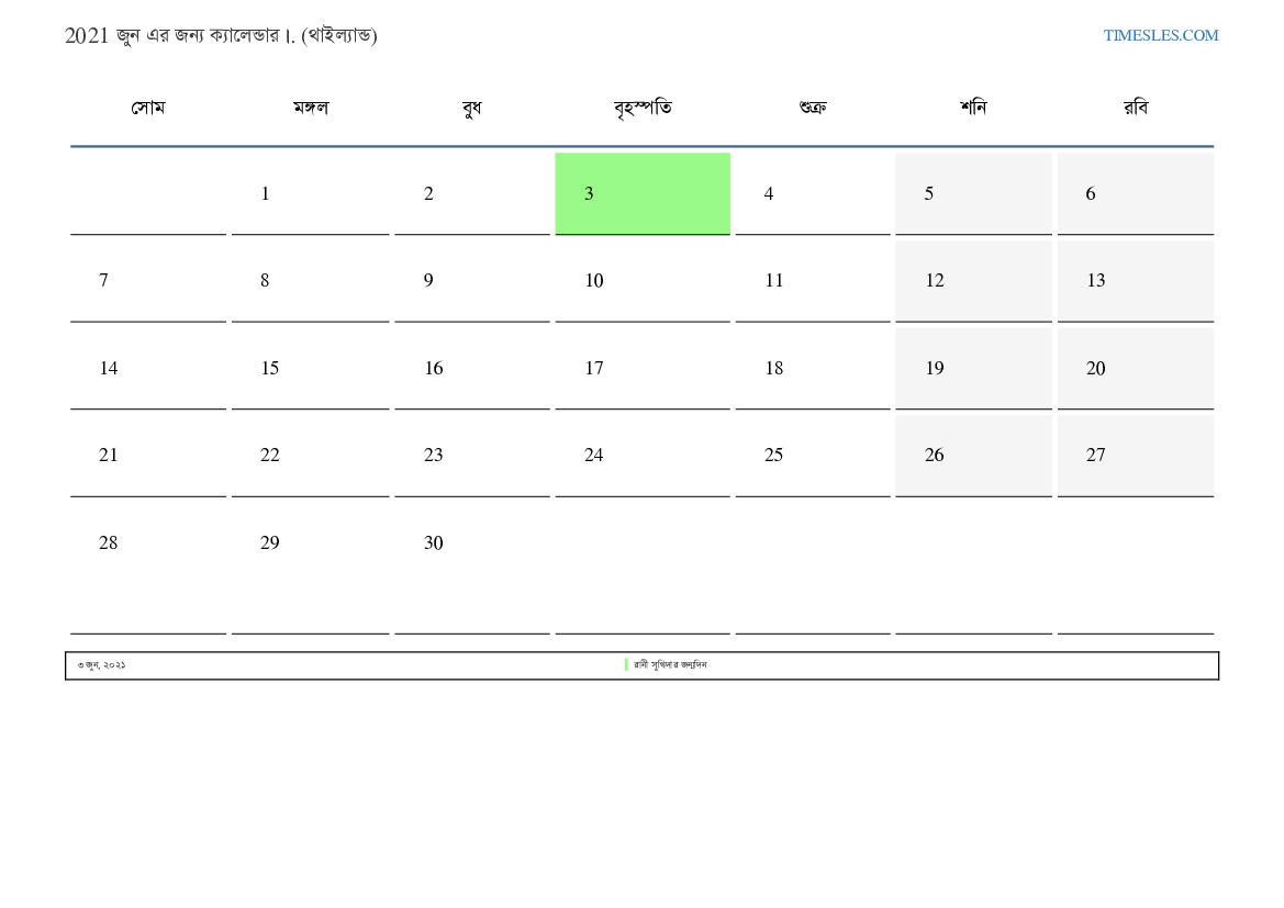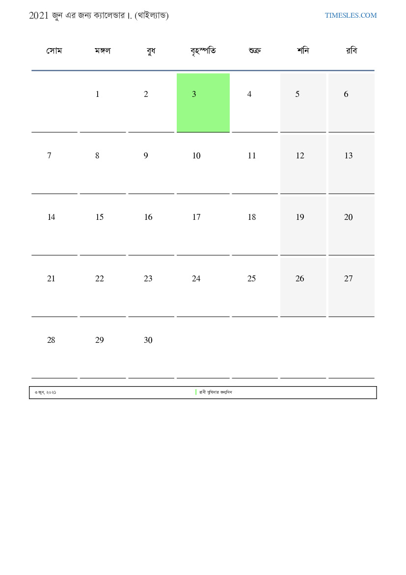 থাইল্যান্ডের জন্য 2021 জুন এর জন্য ছুটির দিন এবং সপ্তাহান্তের ক্যালেন্ডার