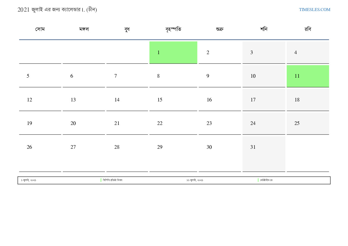 চীন জন্য 2021 জুলাই এর জন্য ছুটির দিন এবং সপ্তাহান্তের ক্যালেন্ডার