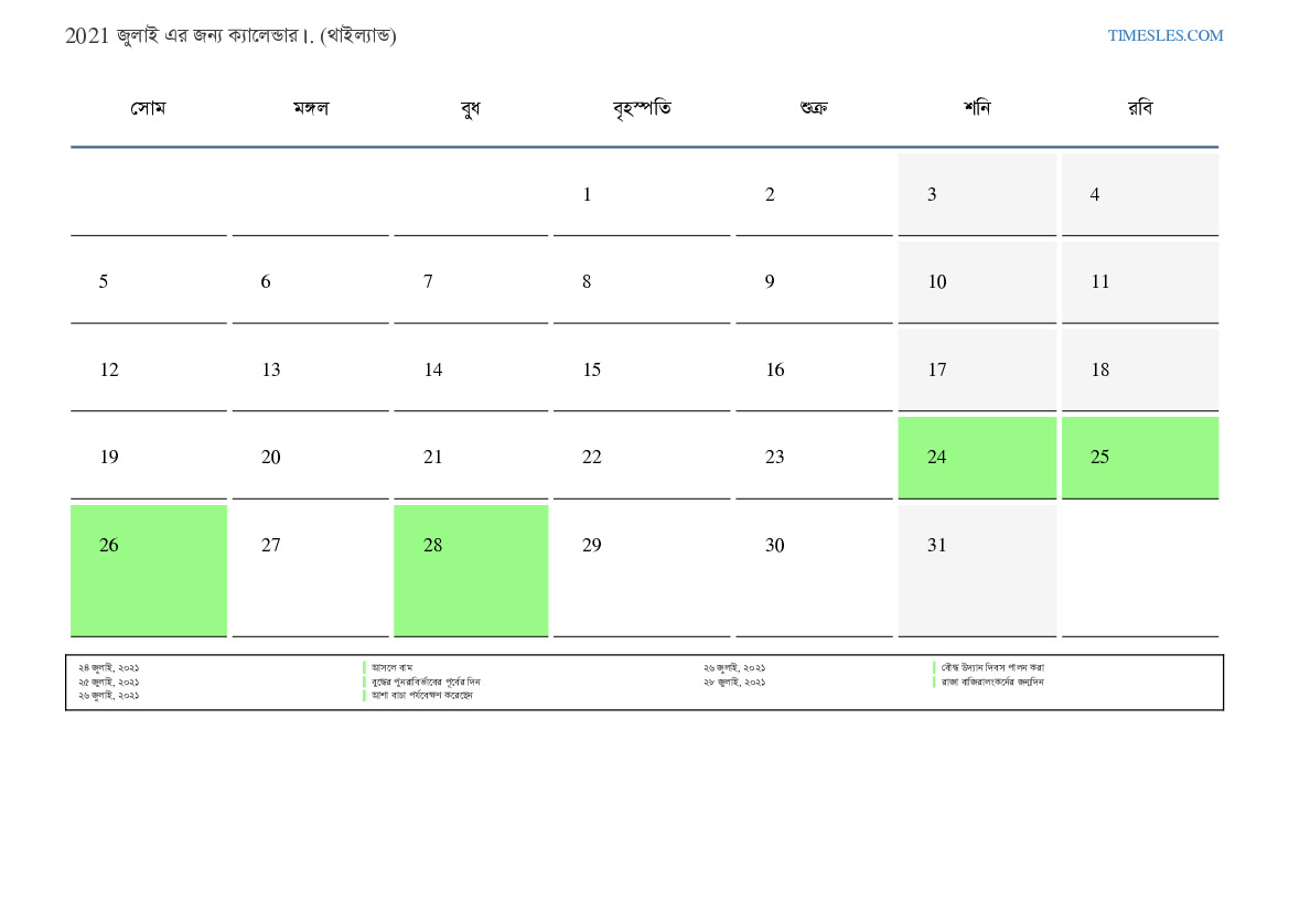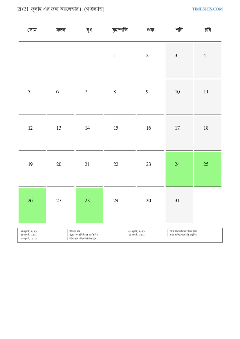 থাইল্যান্ডের জন্য 2021 জুলাই এর জন্য ছুটির দিন এবং সপ্তাহান্তের ক্যালেন্ডার
