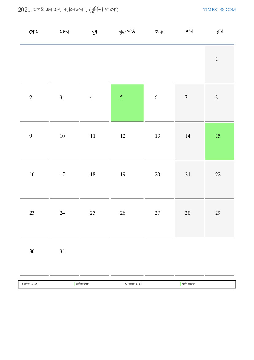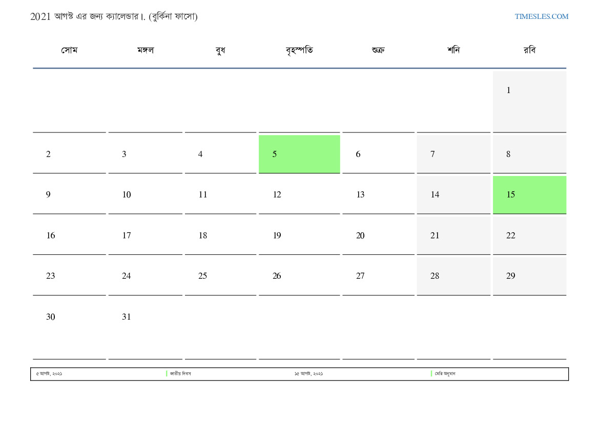 বুর্কিনা ফাসোর জন্য আগস্ট আগস্ট ছুটি এবং সাপ্তাহিক ছুটির সাথে পিডিএফ ক্যালেন্ডার ডাউনলোড এবং মুদ্রণ করুন