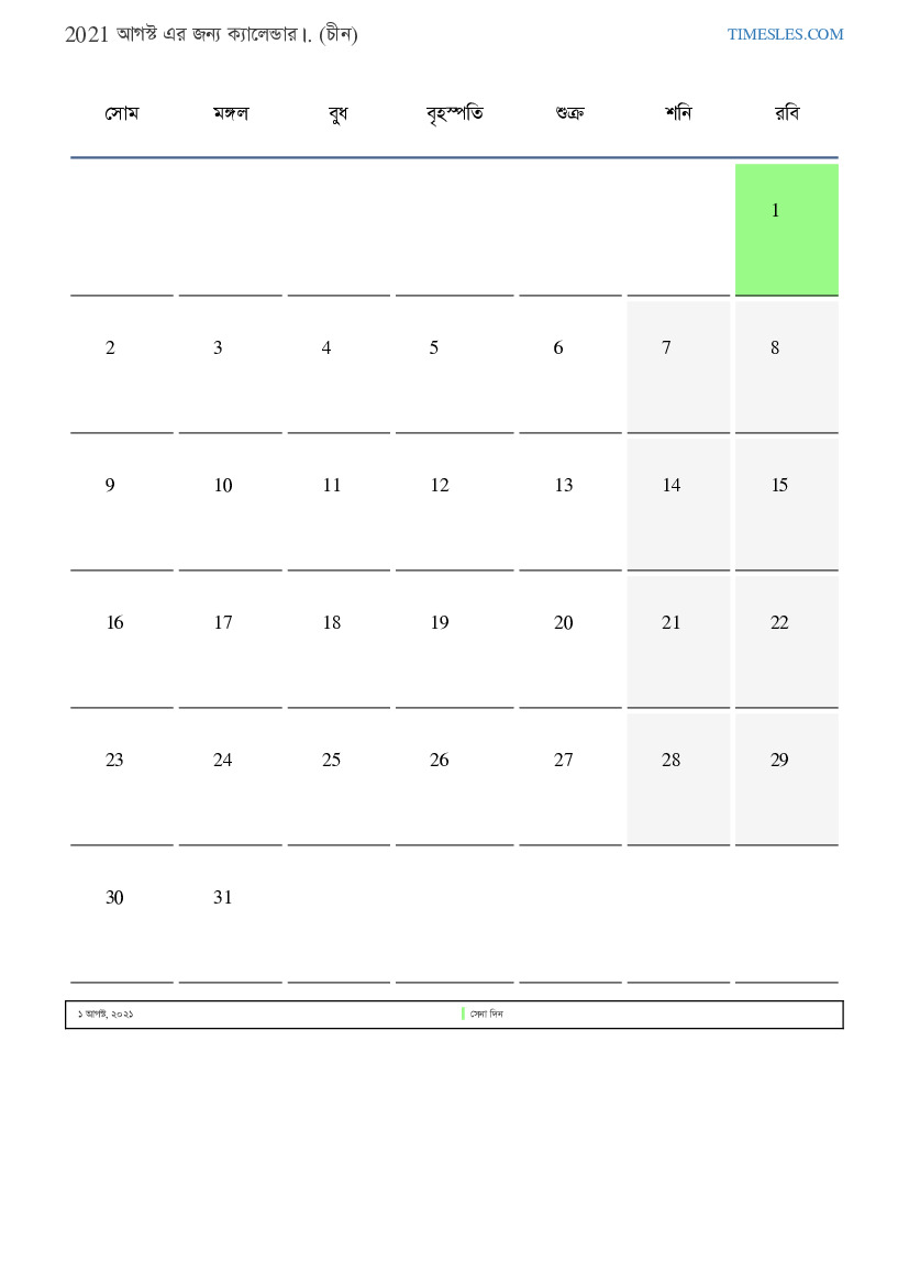 চীন জন্য 2021 আগস্ট এর জন্য ছুটির দিন এবং সপ্তাহান্তের ক্যালেন্ডার