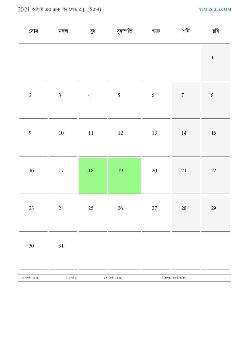 ইরানের জন্য 2021 আগস্ট এর জন্য ছুটির দিন এবং সপ্তাহান্তের ক্যালেন্ডার
