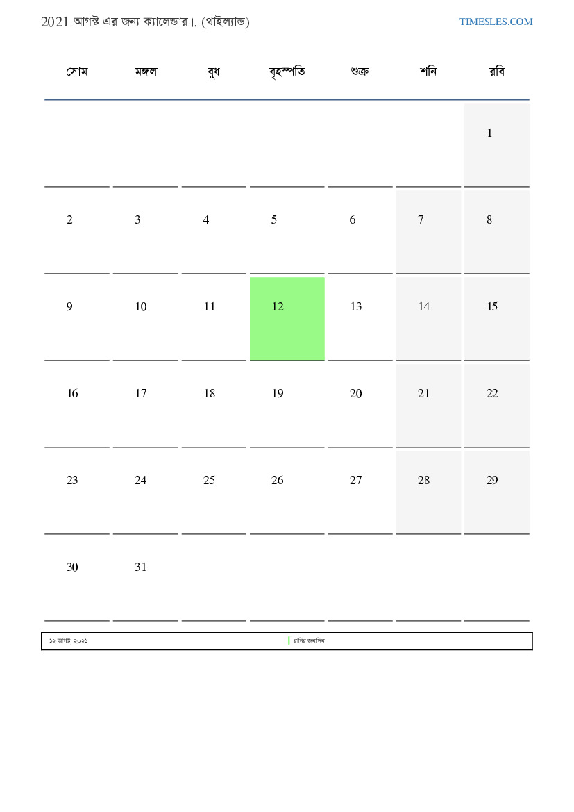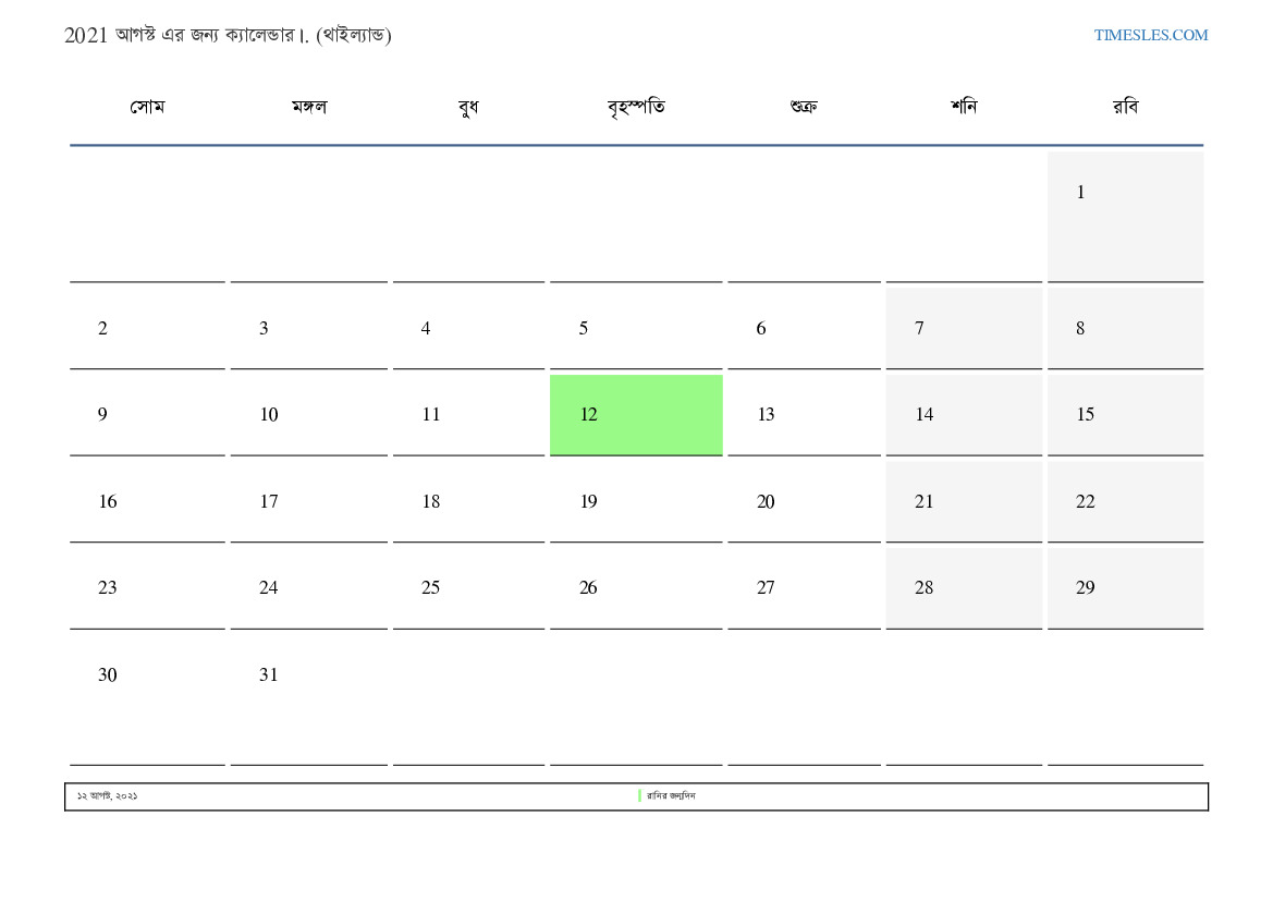 থাইল্যান্ডের জন্য 2021 আগস্ট এর জন্য ছুটির দিন এবং সপ্তাহান্তের ক্যালেন্ডার