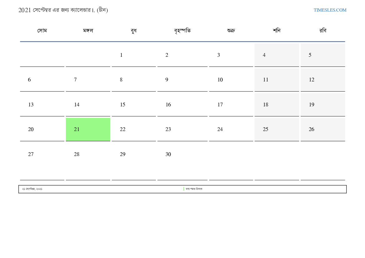 চীন জন্য 2021 সেপ্টেম্বর এর জন্য ছুটির দিন এবং সপ্তাহান্তের ক্যালেন্ডার