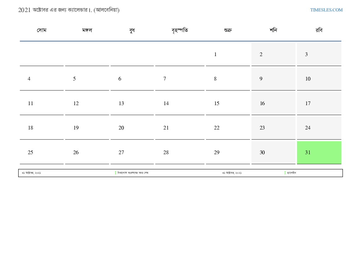 আলবেনিয়ার জন্য 2021 অক্টোবর এর জন্য ছুটির দিন এবং সপ্তাহান্তের ক্যালেন্ডার