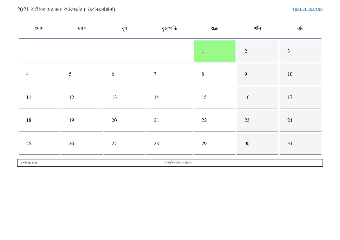 বতসোয়ানা জন্য 2021 অক্টোবর এর জন্য ছুটির দিন এবং সপ্তাহান্তের ক্যালেন্ডার