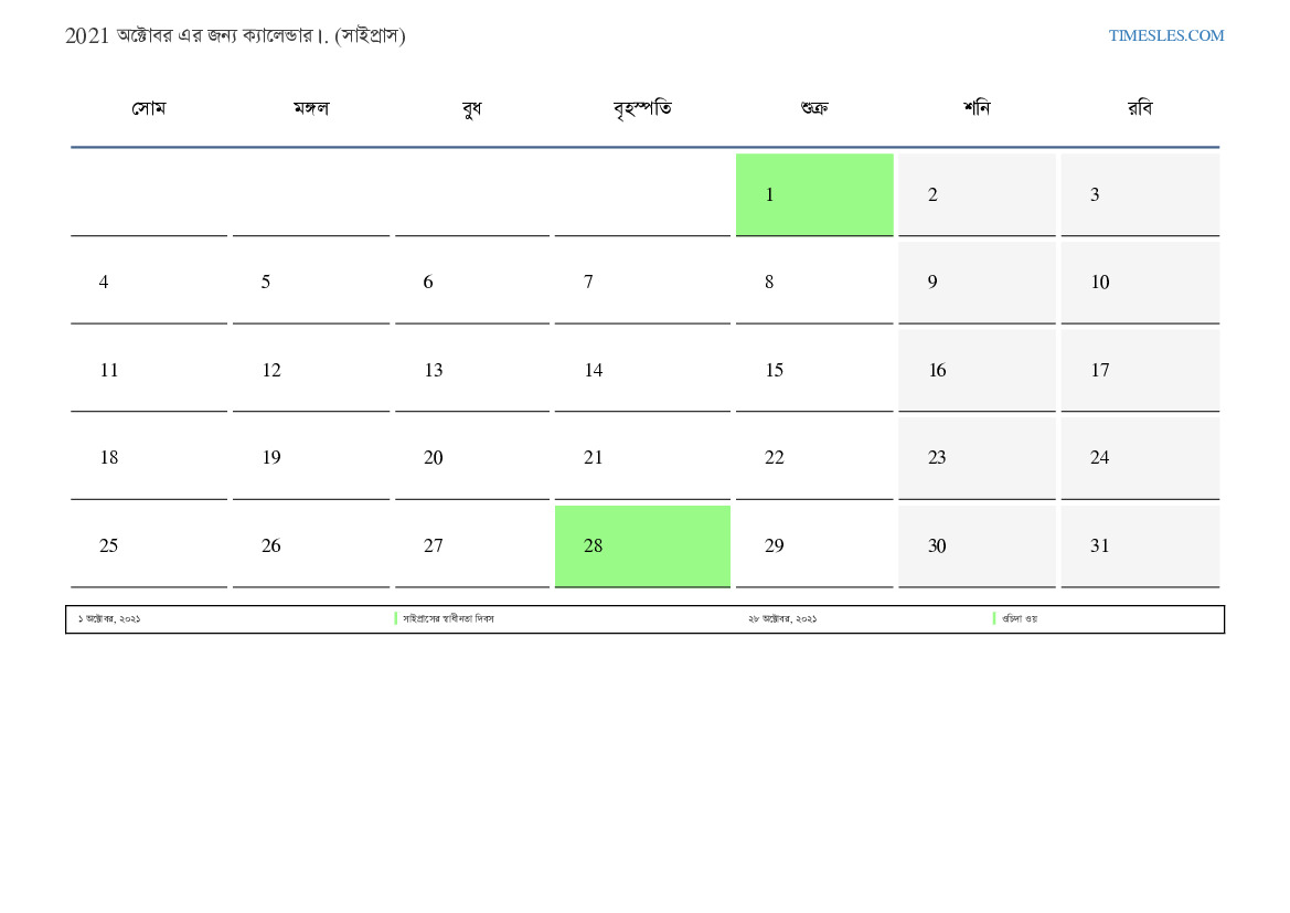 সাইপ্রাসের জন্য 2021 অক্টোবর এর জন্য ছুটির দিন এবং সপ্তাহান্তের ক্যালেন্ডার