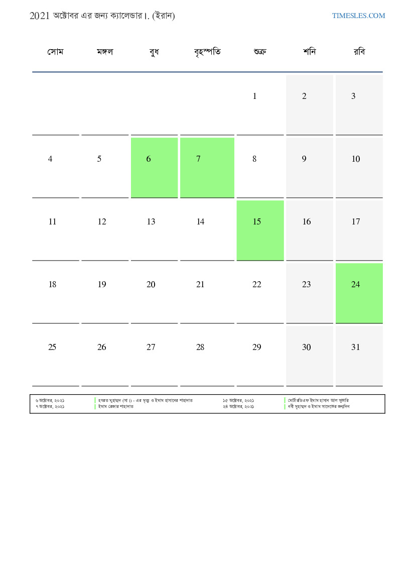ইরানের জন্য 2021 অক্টোবর এর জন্য ছুটির দিন এবং সপ্তাহান্তের ক্যালেন্ডার