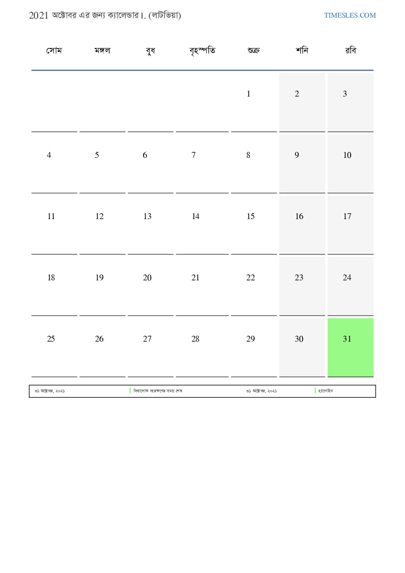 লাটভিয়ার জন্য 2021 অক্টোবর এর জন্য ছুটির দিন এবং সপ্তাহান্তের ক্যালেন্ডার