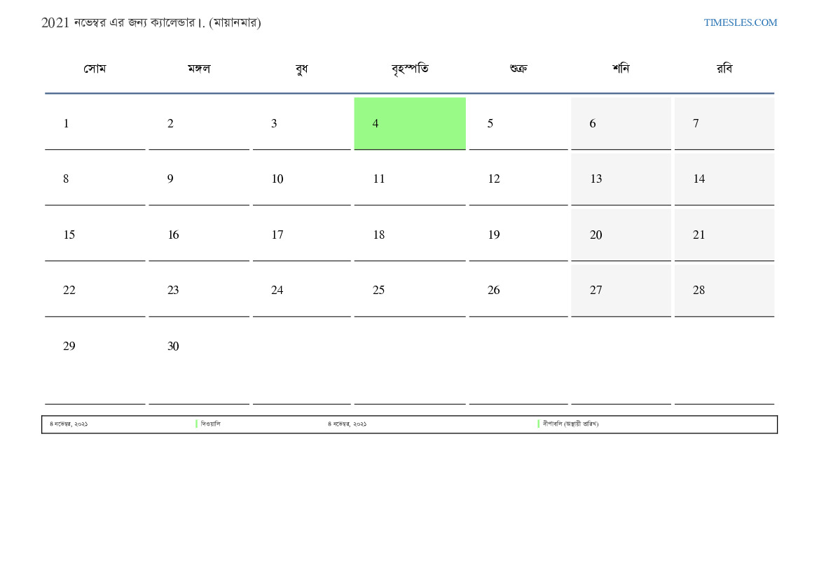 মায়ানমারের জন্য 2021 নভেম্বর এর জন্য ছুটির দিন এবং সপ্তাহান্তের ক্যালেন্ডার