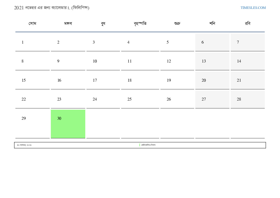 ফিলিপাইন জন্য 2021 নভেম্বর এর জন্য ছুটির দিন এবং সপ্তাহান্তের ক্যালেন্ডার