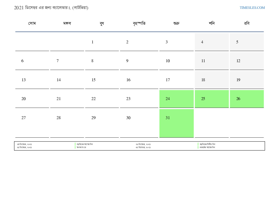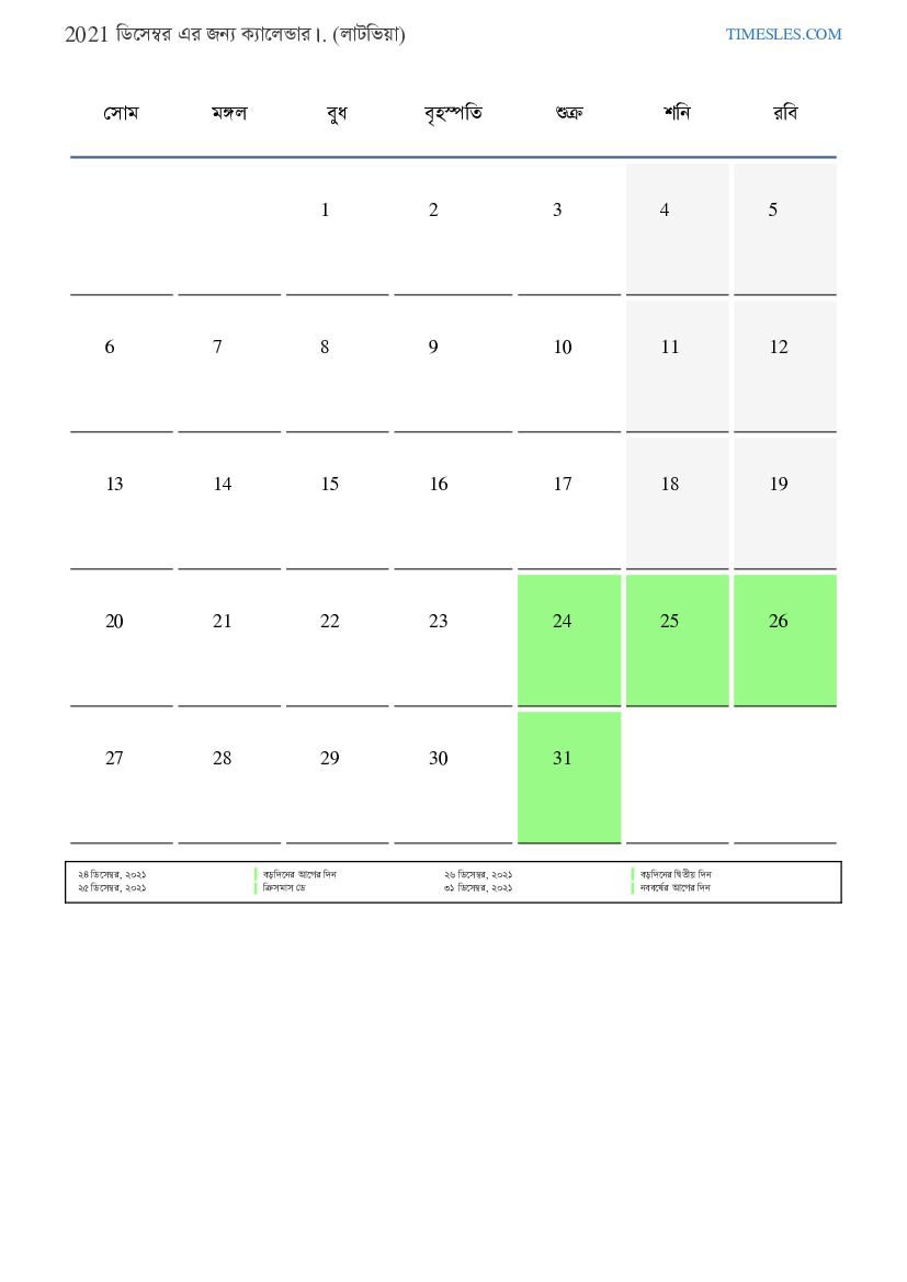 লাটভিয়ার জন্য 2021 ডিসেম্বর এর জন্য ছুটির দিন এবং সপ্তাহান্তের ক্যালেন্ডার