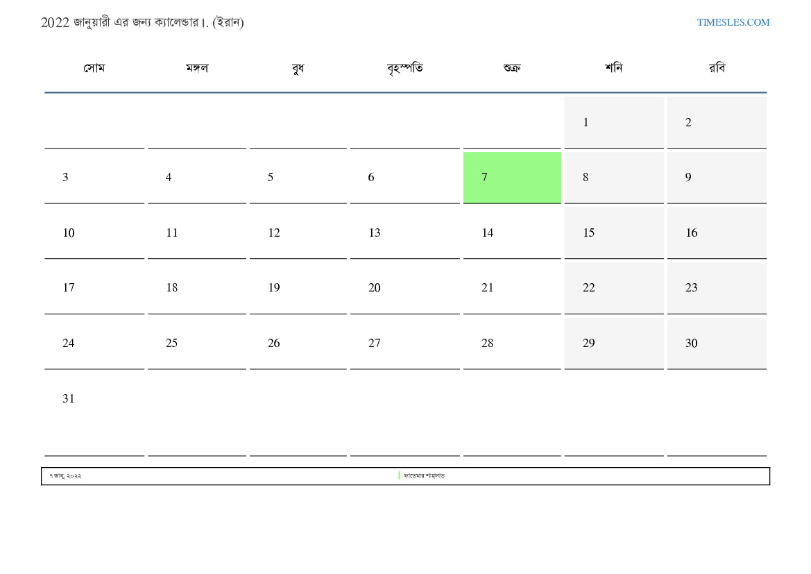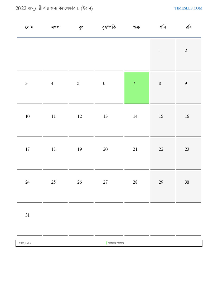 ইরানের জন্য 2022 জানুয়ারী এর জন্য ছুটির দিন এবং সপ্তাহান্তের ক্যালেন্ডার