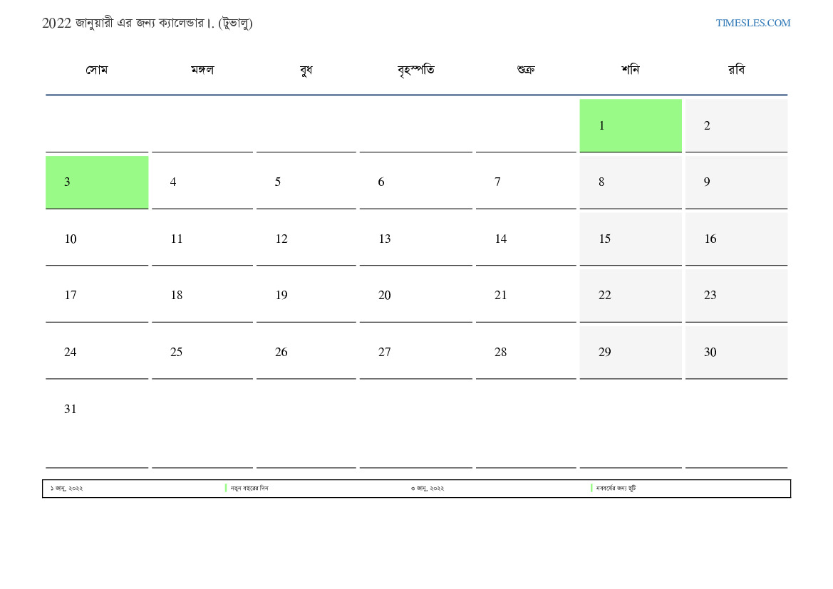 টুভালুর জন্য 2022 জানুয়ারী এর জন্য ছুটির দিন এবং সপ্তাহান্তের ক্যালেন্ডার