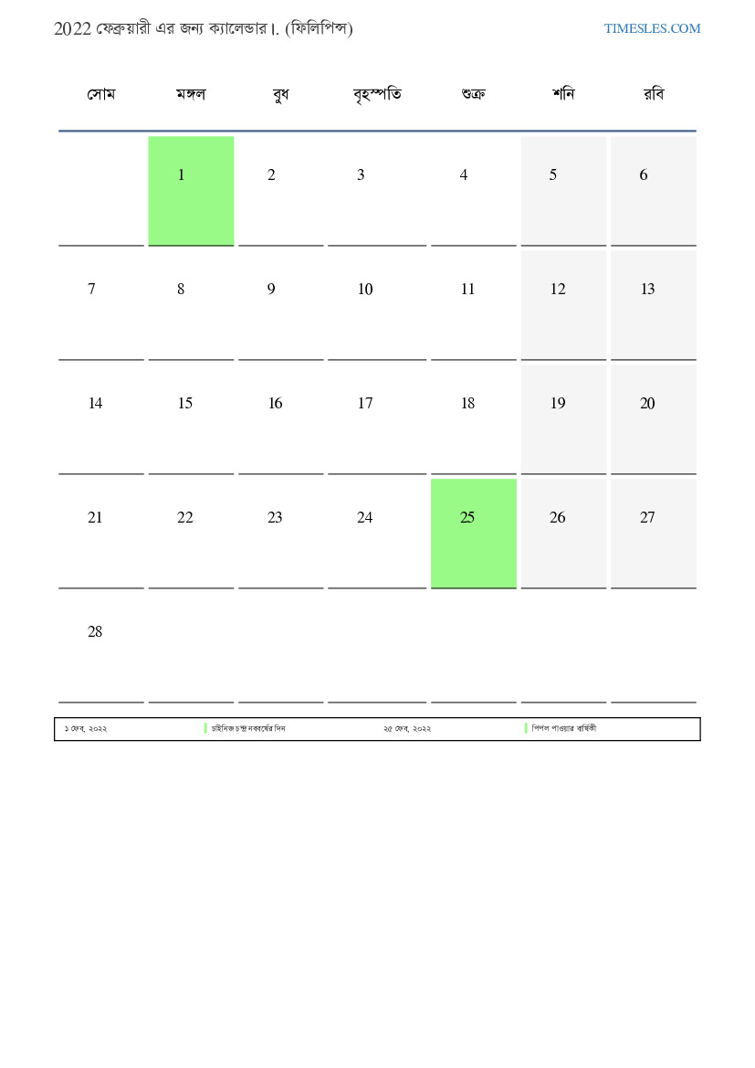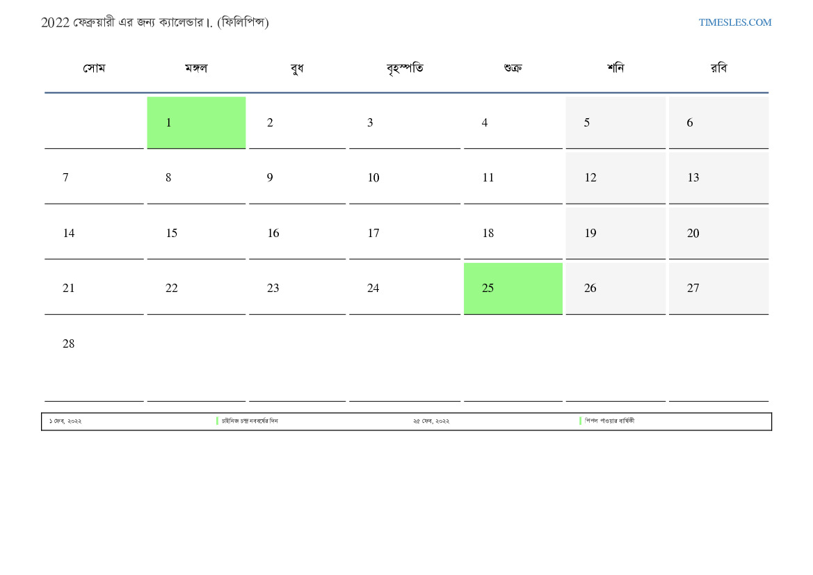 ফিলিপাইন জন্য 2022 ফেব্রুয়ারী এর জন্য ছুটির দিন এবং সপ্তাহান্তের ক্যালেন্ডার