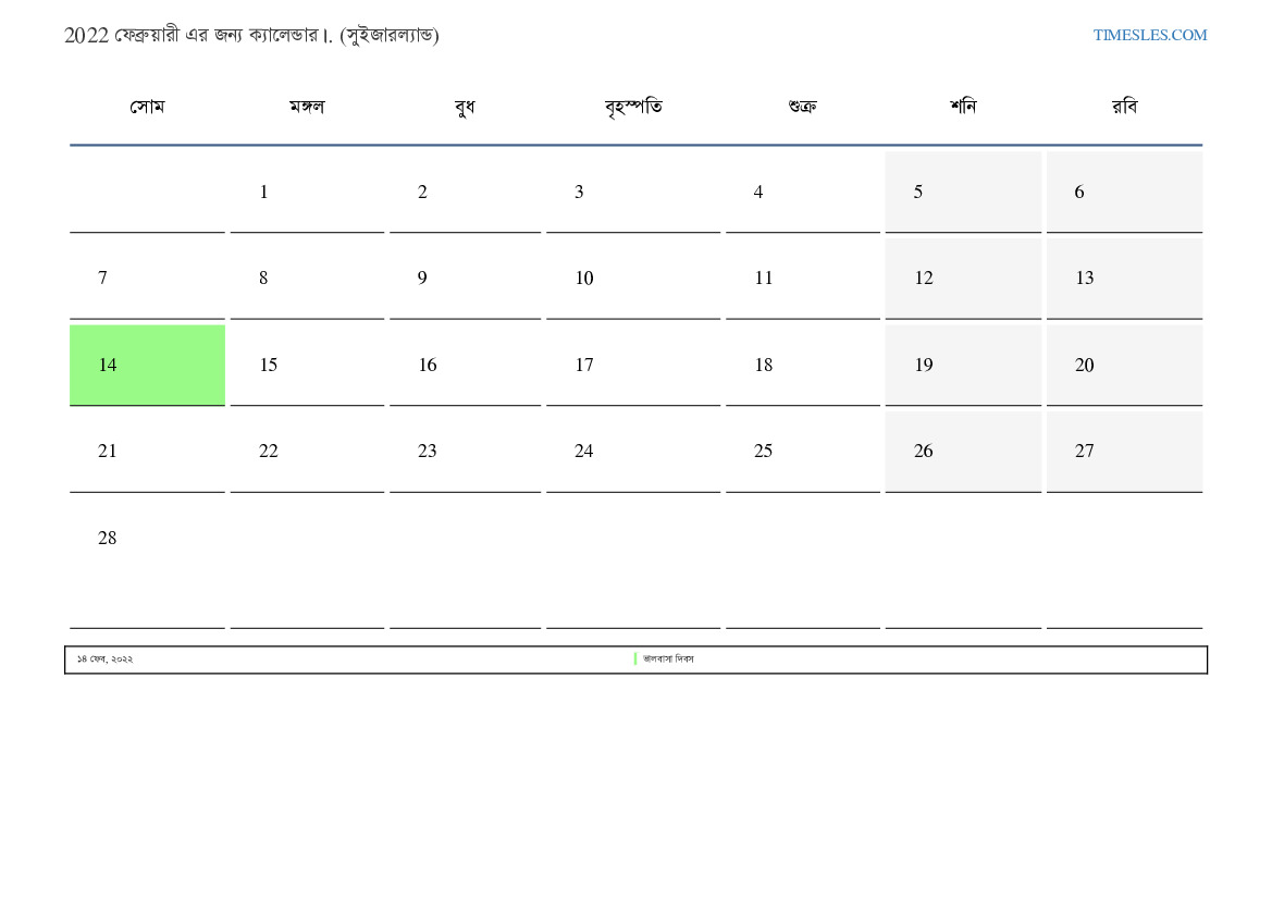 সুইজারল্যান্ডের জন্য 2022 ফেব্রুয়ারী এর জন্য ছুটির দিন এবং সপ্তাহান্তের ক্যালেন্ডার