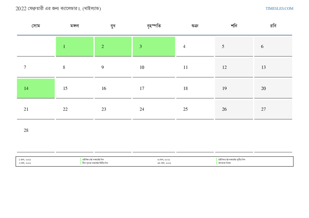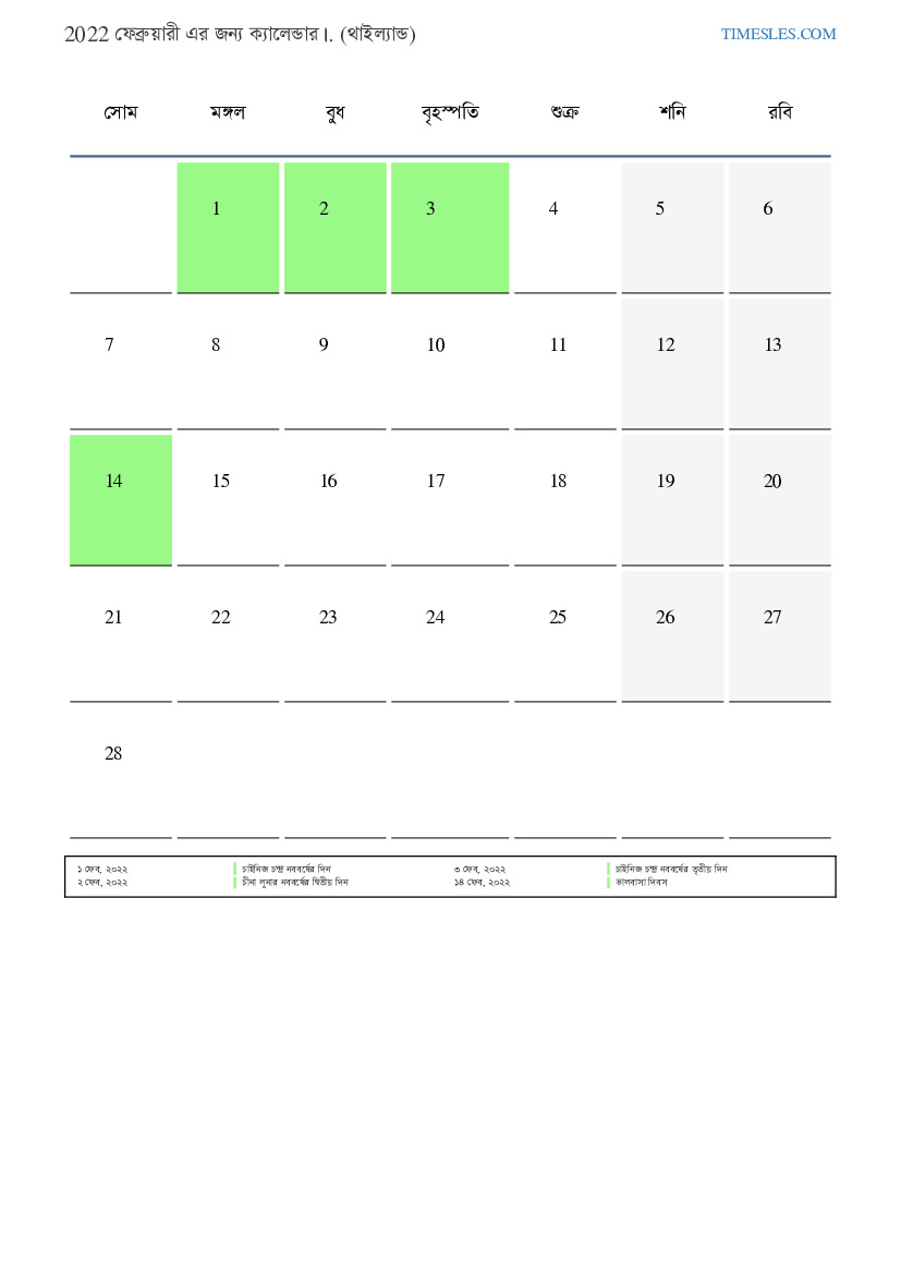 ফেব্রুয়ারী মাসে 28 দিন রয়েছে। এটি 2022 এর 2 মাস | বছরের মরসুম: শীত। ফেব্রুয়ারী মাস মঙ্গলবারে থেকে শুরু হয়ে সোমবারে শেষ হয়। 2022 ফেব্রুয়ারী মাসে, থাইল্যান্ডে ৪ ছুটি এবং দিন ছুটি রয়েছে।
