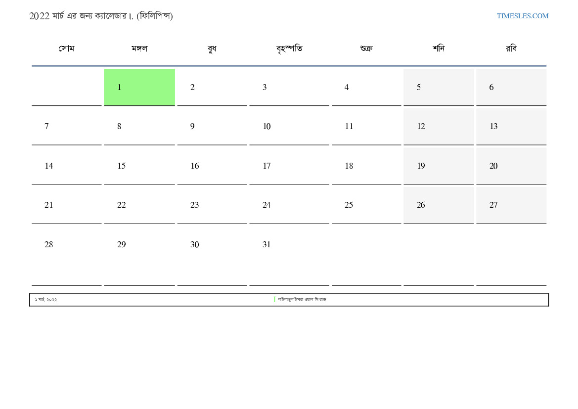 ফিলিপাইন জন্য 2022 মার্চ এর জন্য ছুটির দিন এবং সপ্তাহান্তের ক্যালেন্ডার
