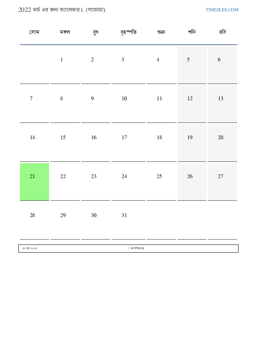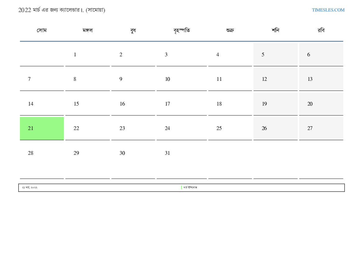 সামোয়া জন্য 2022 মার্চ এর জন্য ছুটির দিন এবং সপ্তাহান্তের ক্যালেন্ডার