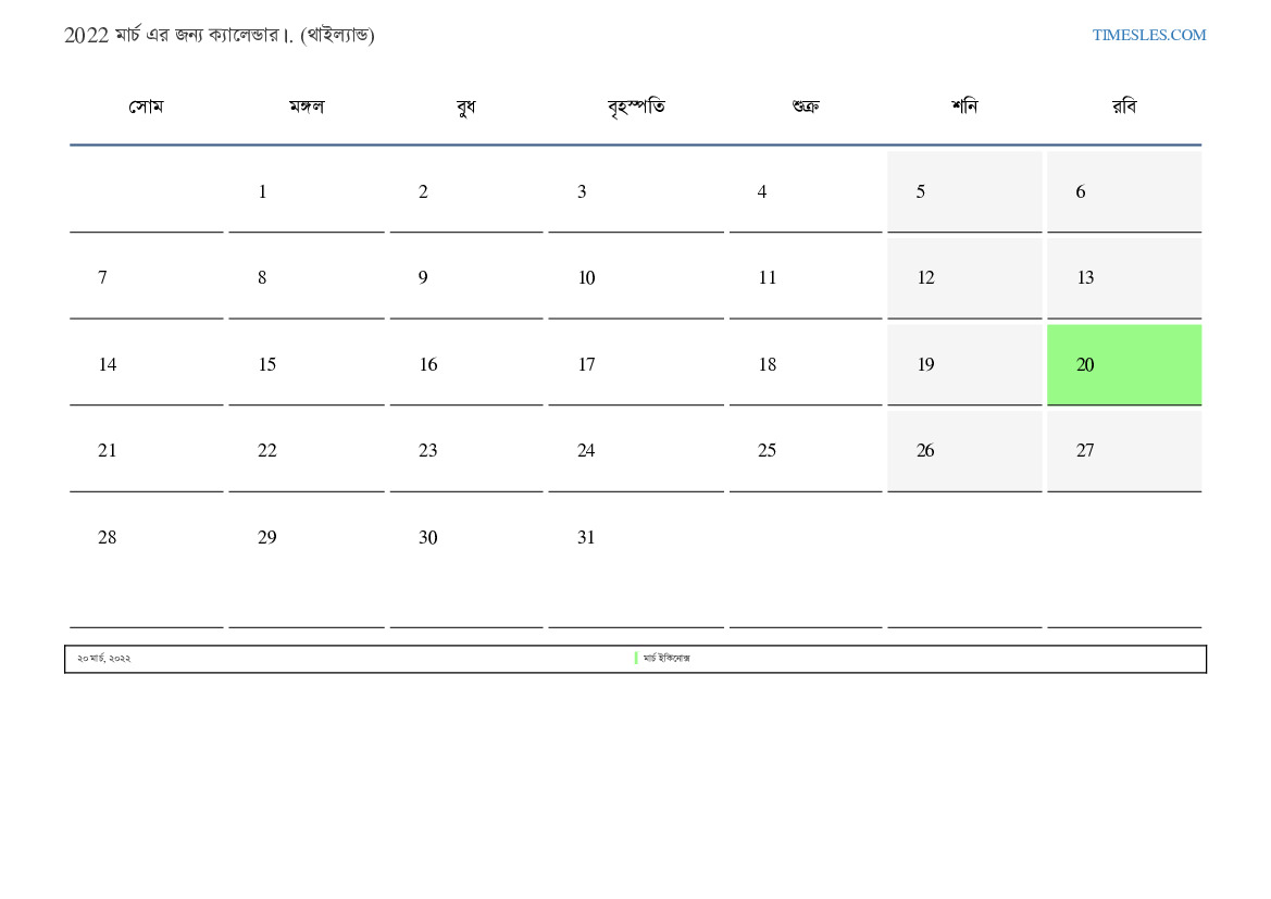 মার্চ মাসে 31 দিন রয়েছে। এটি 2022 এর 3 মাস | বছরের মরসুম: বসন্ত। মার্চ মাস মঙ্গলবারে থেকে শুরু হয়ে বৃহস্পতিবার শেষ হয়। 2022 মার্চ মাসে, থাইল্যান্ডে ১ ছুটি এবং দিন ছুটি রয়েছে।