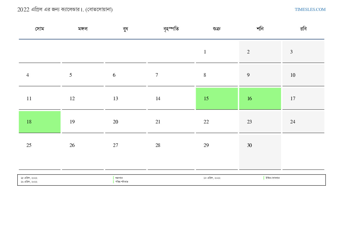 বতসোয়ানা জন্য 2022 এপ্রিল এর জন্য ছুটির দিন এবং সপ্তাহান্তের ক্যালেন্ডার