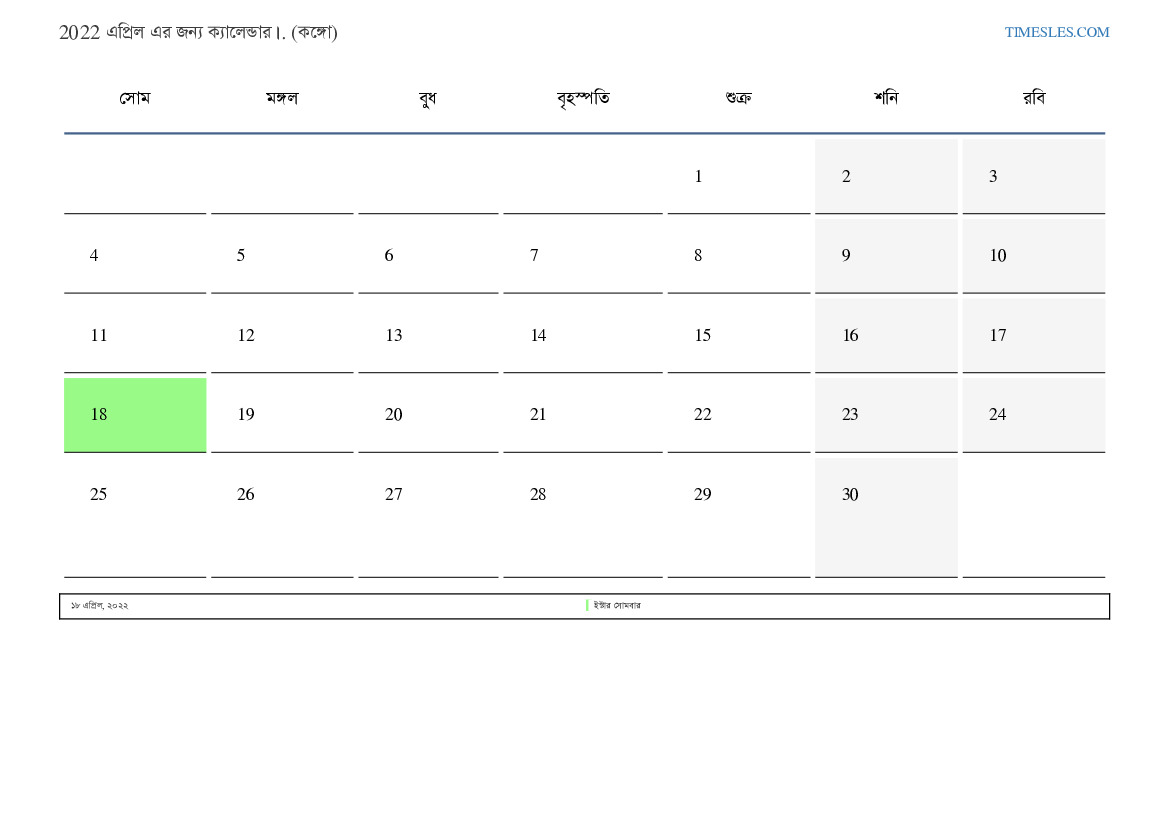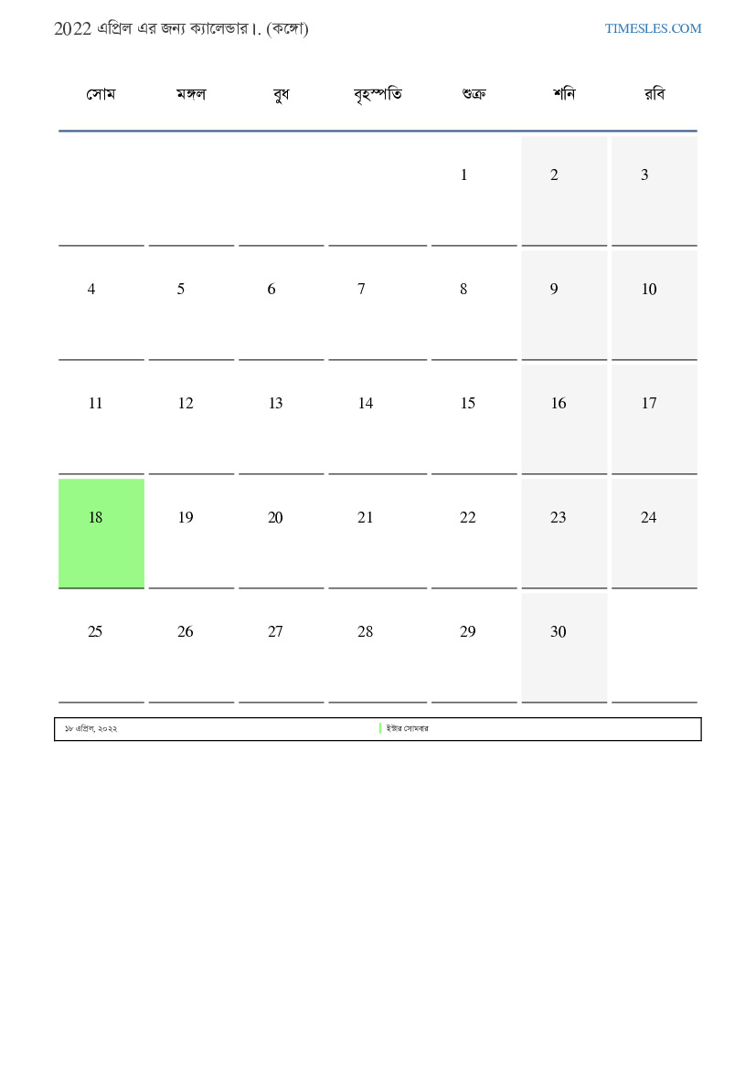 কঙ্গোর জন্য 2022 এপ্রিল এর জন্য ছুটির দিন এবং সপ্তাহান্তের ক্যালেন্ডার