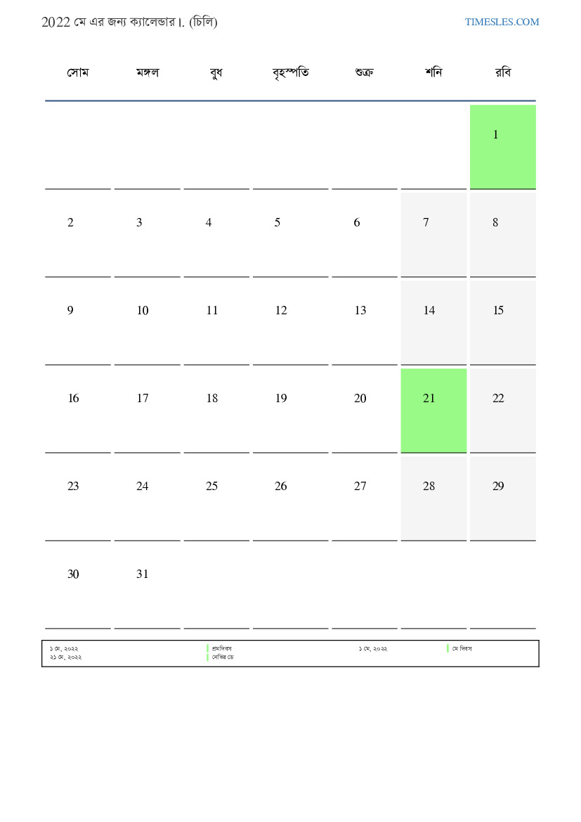 মে মাসে 31 দিন রয়েছে। এটি 2022 এর 5 মাস | বছরের মরসুম: বসন্ত। মে মাস রবিবারে থেকে শুরু হয়ে মঙ্গলবারে শেষ হয়। 2022 মে মাসে, চিলিতে ৩ ছুটি এবং দিন ছুটি রয়েছে।