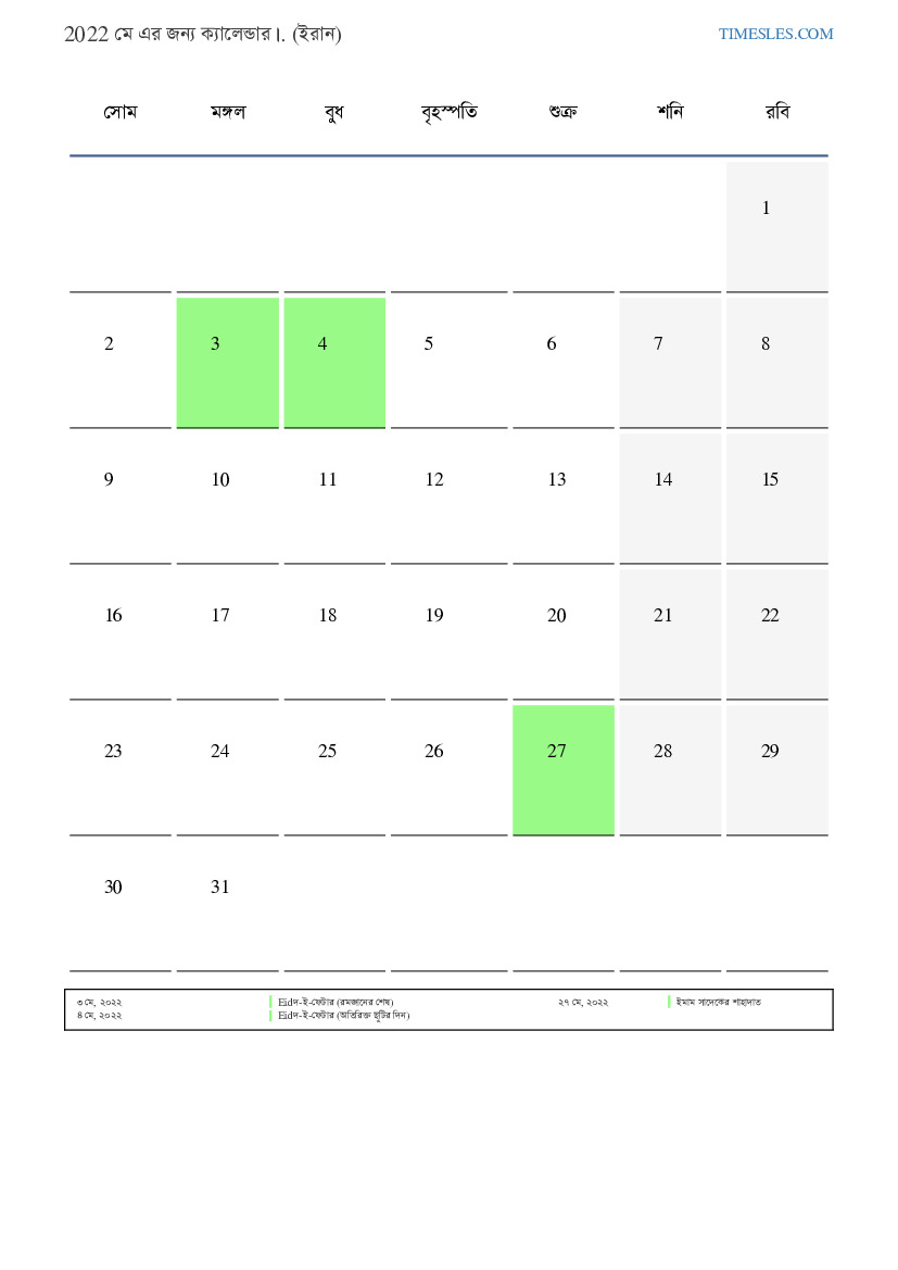 ইরানের জন্য 2022 মে এর জন্য ছুটির দিন এবং সপ্তাহান্তের ক্যালেন্ডার