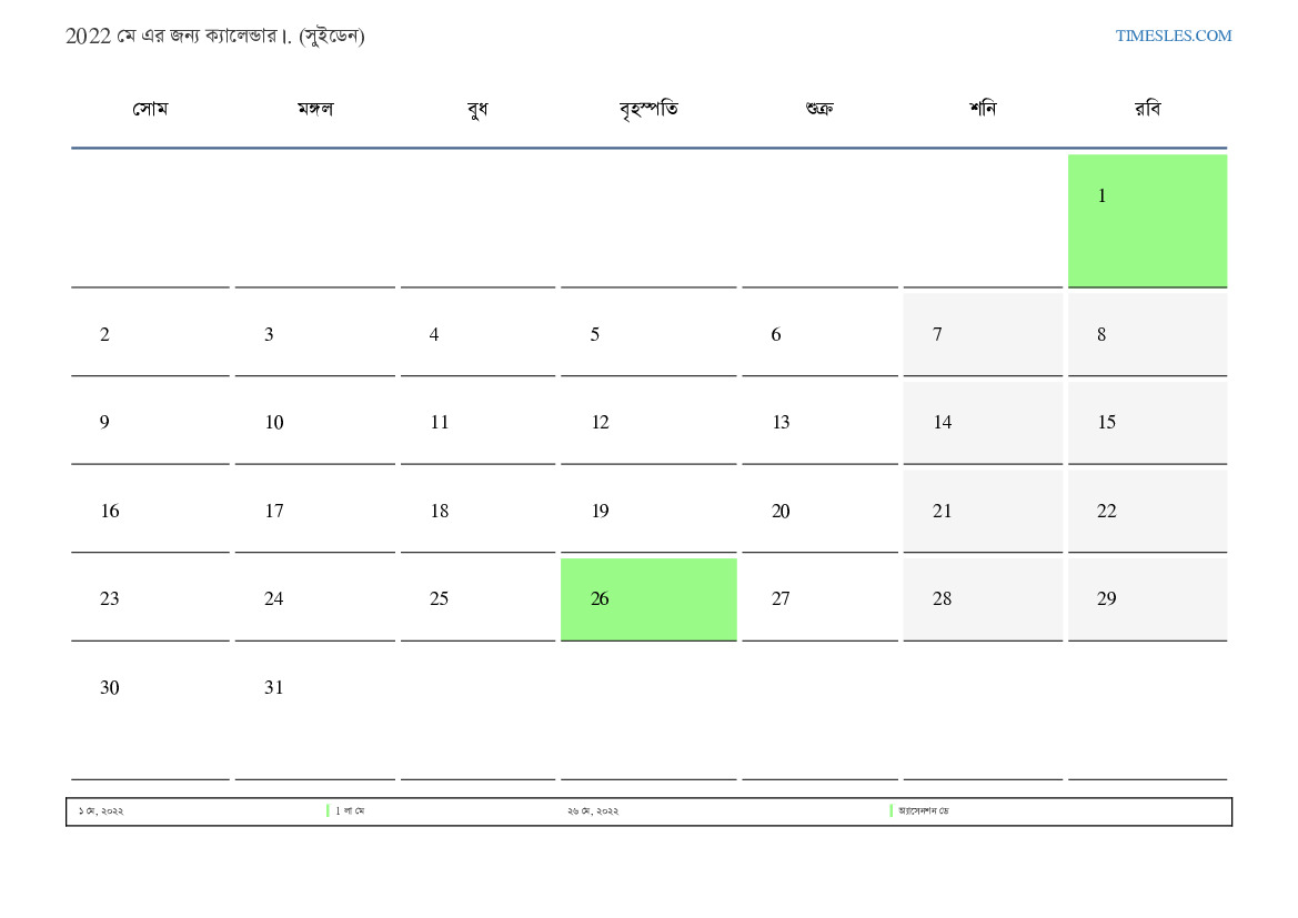 সুইডেনের জন্য 2022 মে এর জন্য ছুটির দিন এবং সপ্তাহান্তের ক্যালেন্ডার