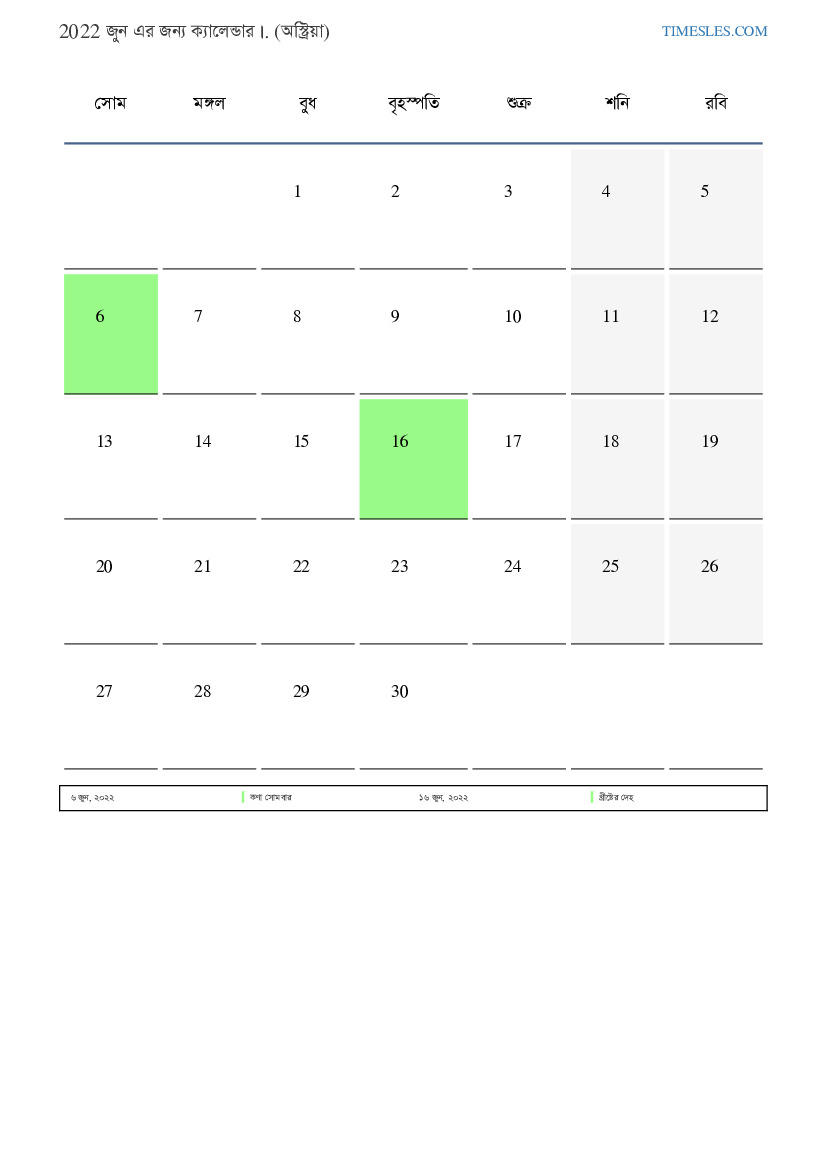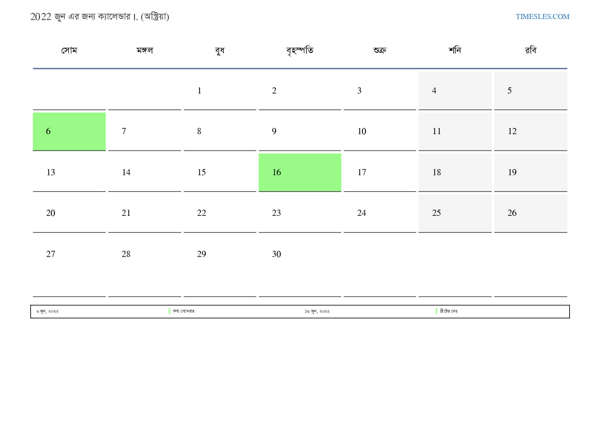 জুন মাসে 30 দিন রয়েছে। এটি 2022 এর 6 মাস | বছরের মরসুম: গ্রীষ্ম। জুন মাস বুধবারে থেকে শুরু হয়ে বৃহস্পতিবার শেষ হয়। 2022 জুন মাসে, অস্ট্রিয়ায় ৪ ছুটি এবং দিন ছুটি রয়েছে।
