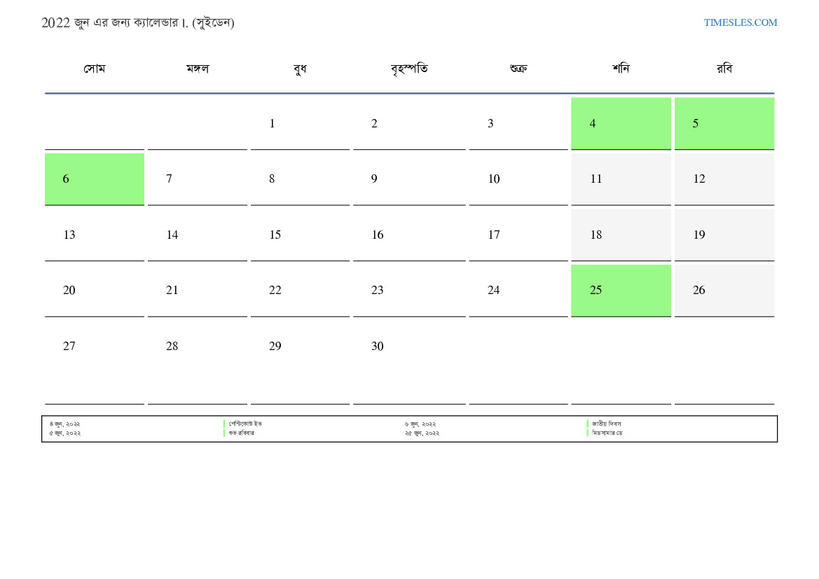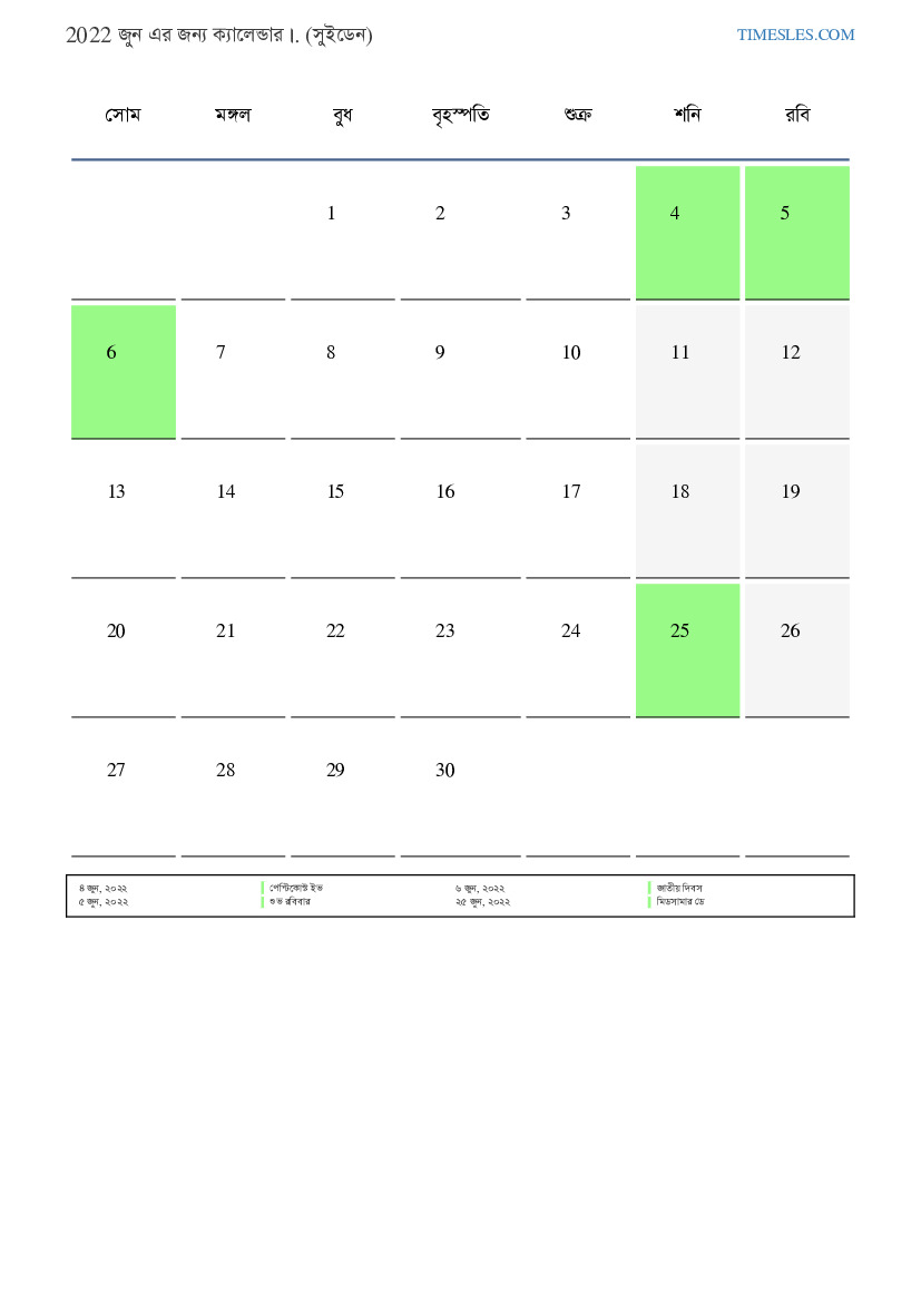 সুইডেনের জন্য 2022 জুন এর জন্য ছুটির দিন এবং সপ্তাহান্তের ক্যালেন্ডার