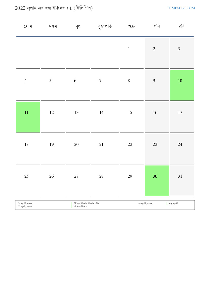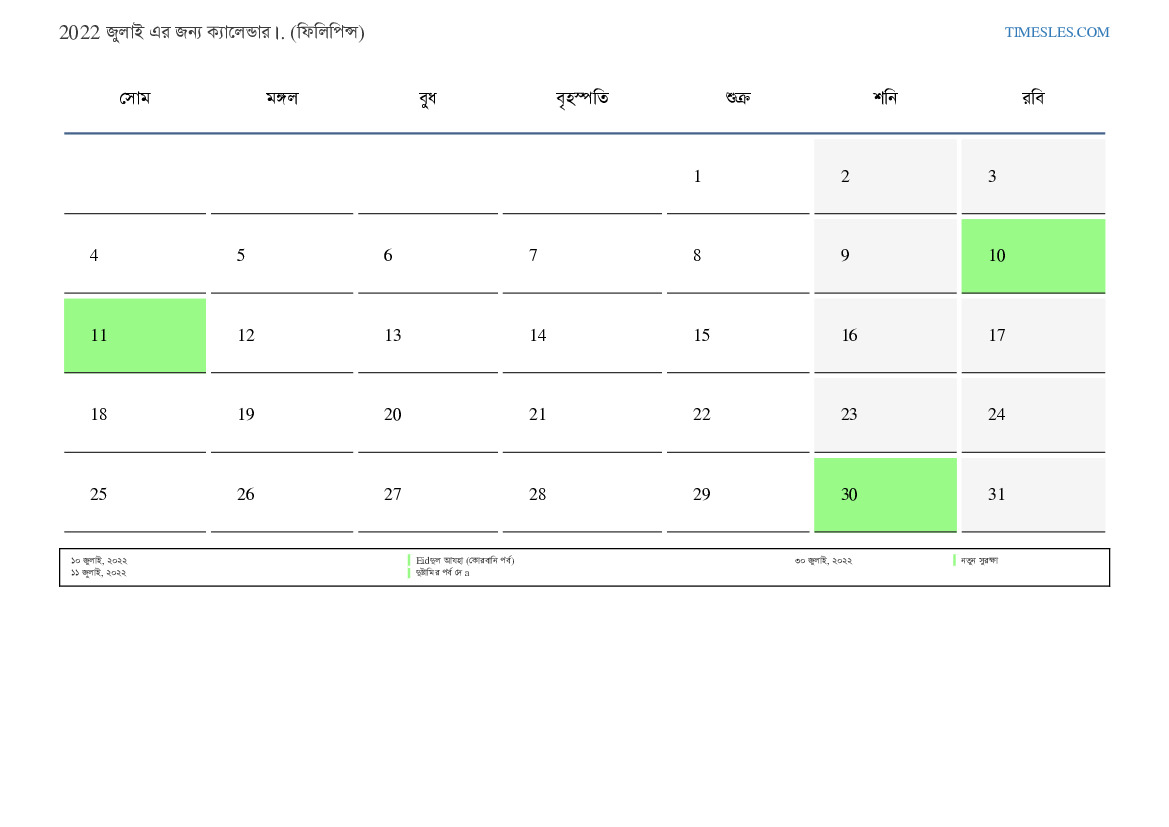 ফিলিপাইন জন্য 2022 জুলাই এর জন্য ছুটির দিন এবং সপ্তাহান্তের ক্যালেন্ডার