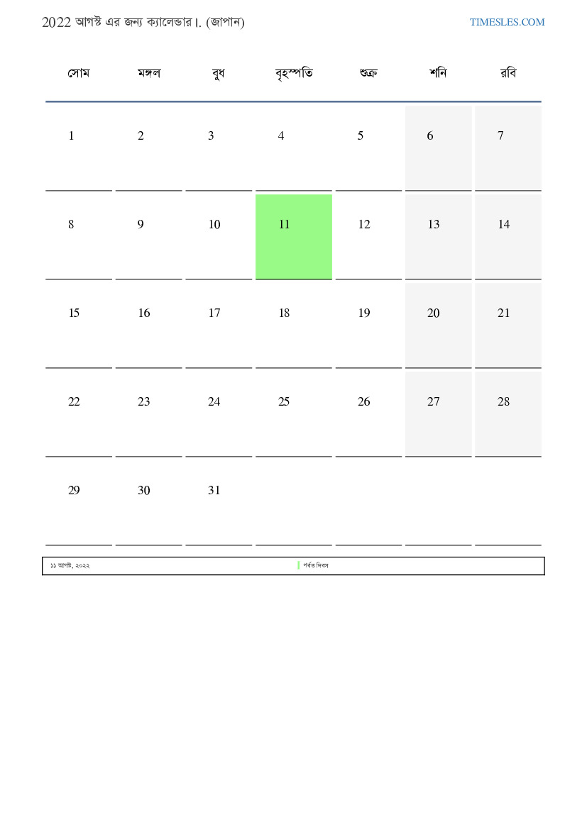 জাপানের জন্য 2022 আগস্ট এর জন্য ছুটির দিন এবং সপ্তাহান্তের ক্যালেন্ডার