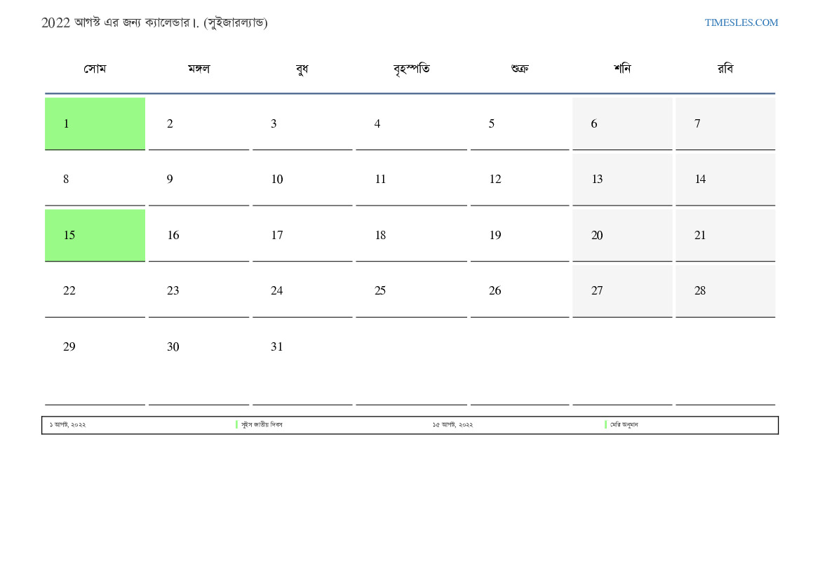 সুইজারল্যান্ডের জন্য 2022 আগস্ট এর জন্য ছুটির দিন এবং সপ্তাহান্তের ক্যালেন্ডার
