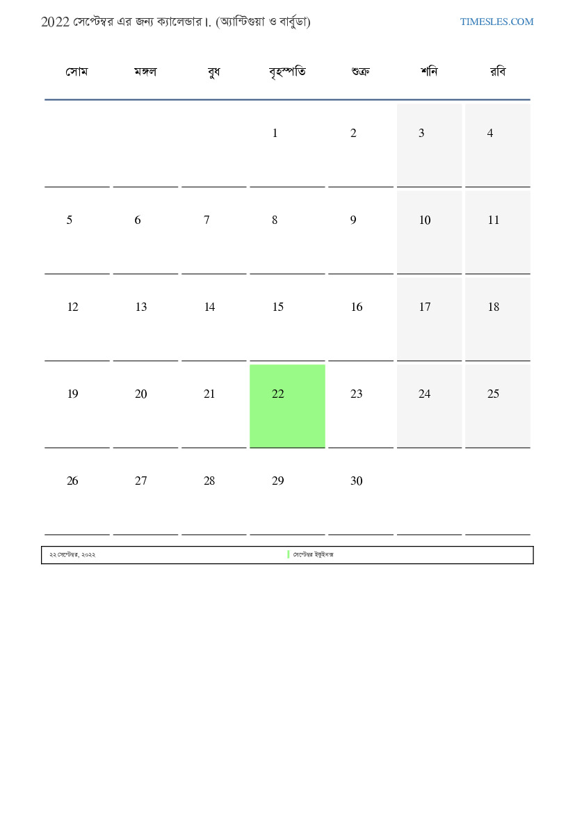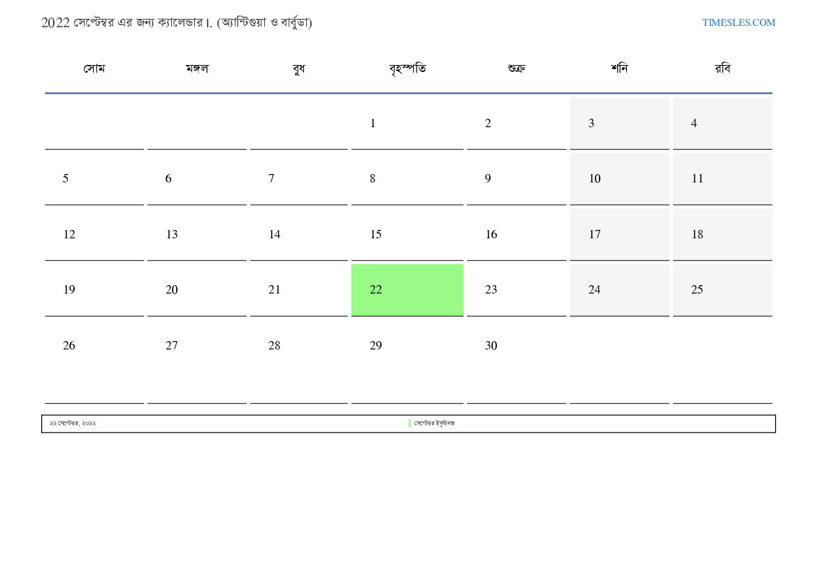 সেপ্টেম্বর মাসে 30 দিন রয়েছে। এটি 2022 এর 9 মাস | বছরের মরসুম: শরত। সেপ্টেম্বর মাস বৃহস্পতিবার থেকে শুরু হয়ে শুক্রবার শেষ হয়। 2022 সেপ্টেম্বর মাসে, অ্যান্টিগা এবং বার্বুডায় ১ ছুটি এবং দিন ছুটি রয়েছে।