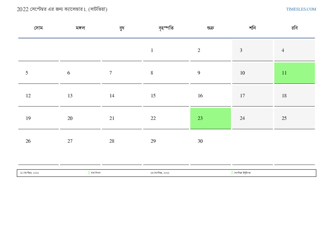 লাটভিয়ার জন্য 2022 সেপ্টেম্বর এর জন্য ছুটির দিন এবং সপ্তাহান্তের ক্যালেন্ডার